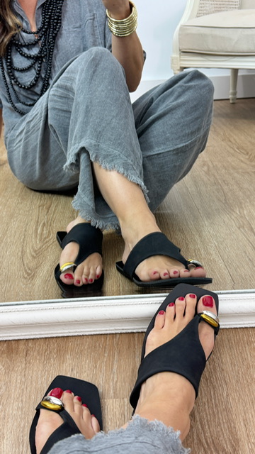 Sandalias tipo mule con doble anillo en dorado y plata en color negras. Tallan normal. Elige tu talla habitual.