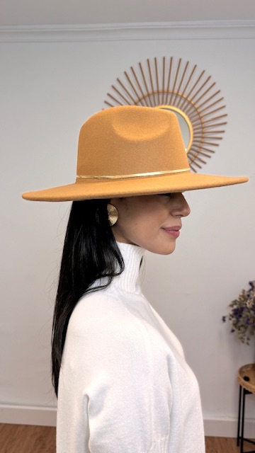 Sombrero de paño en color camel con tira dorada. Interior ajustable .