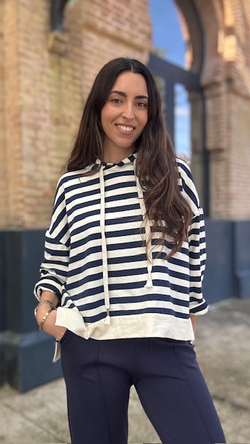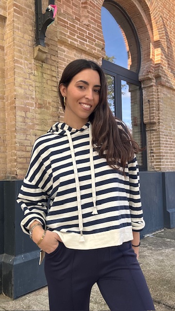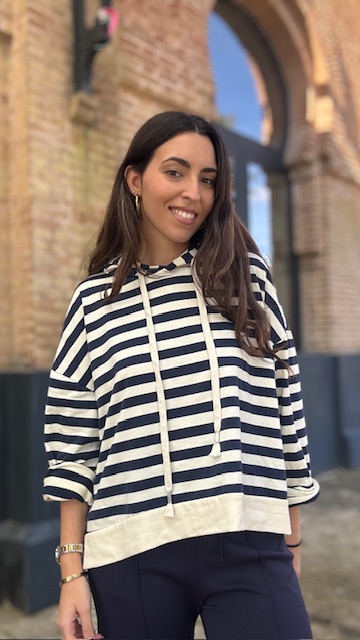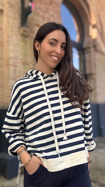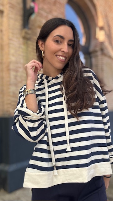 Sudadera oversize con estampado de rayas en blanco y azul marino . Talla única válida desde la 36 hasta la 44.