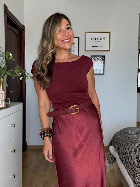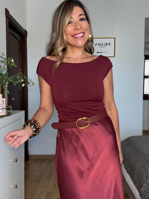 Top-camiseta confeccionado en tejido de punto elástico con color burdeos. Talla única válida desde la 36 hasta la 40.
