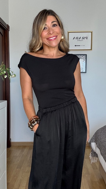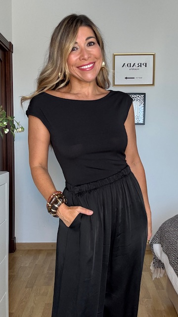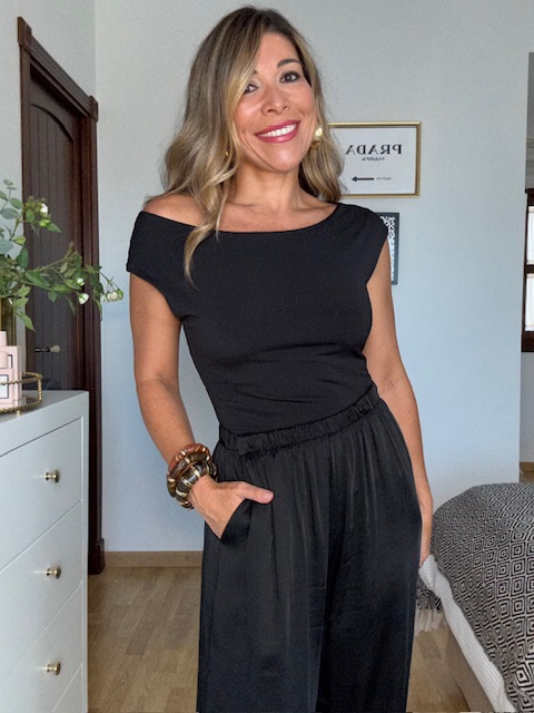 Top-camiseta confeccionado en tejido de punto elástico con color negro. Talla única válida desde la 36 hasta la 40.