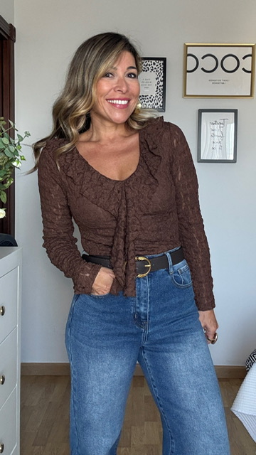 Top de encaje en color marrón con volante en la parte delantera. Talla única válida desde la 36 hasta la 40/42.