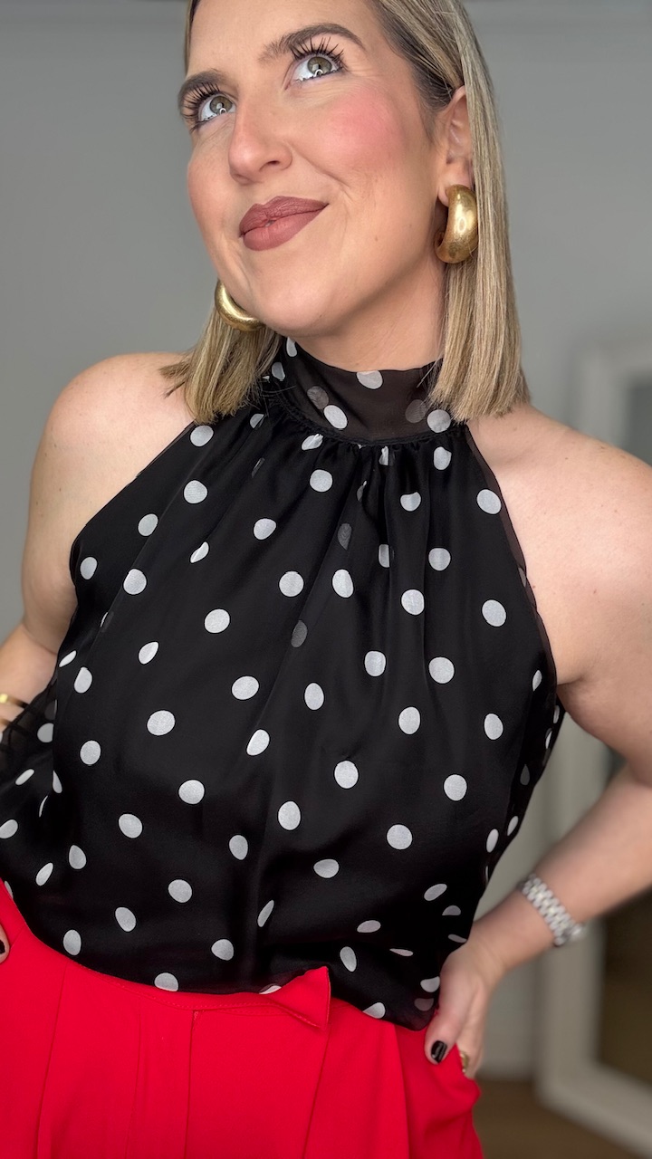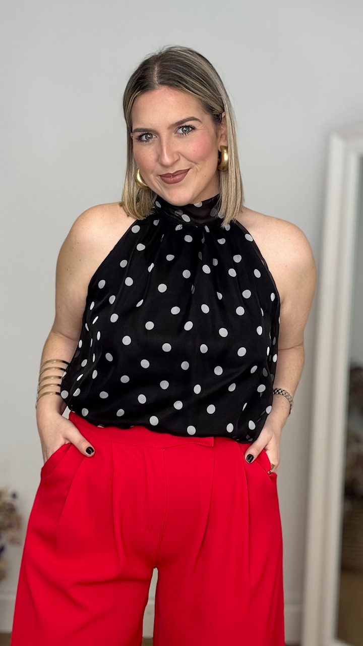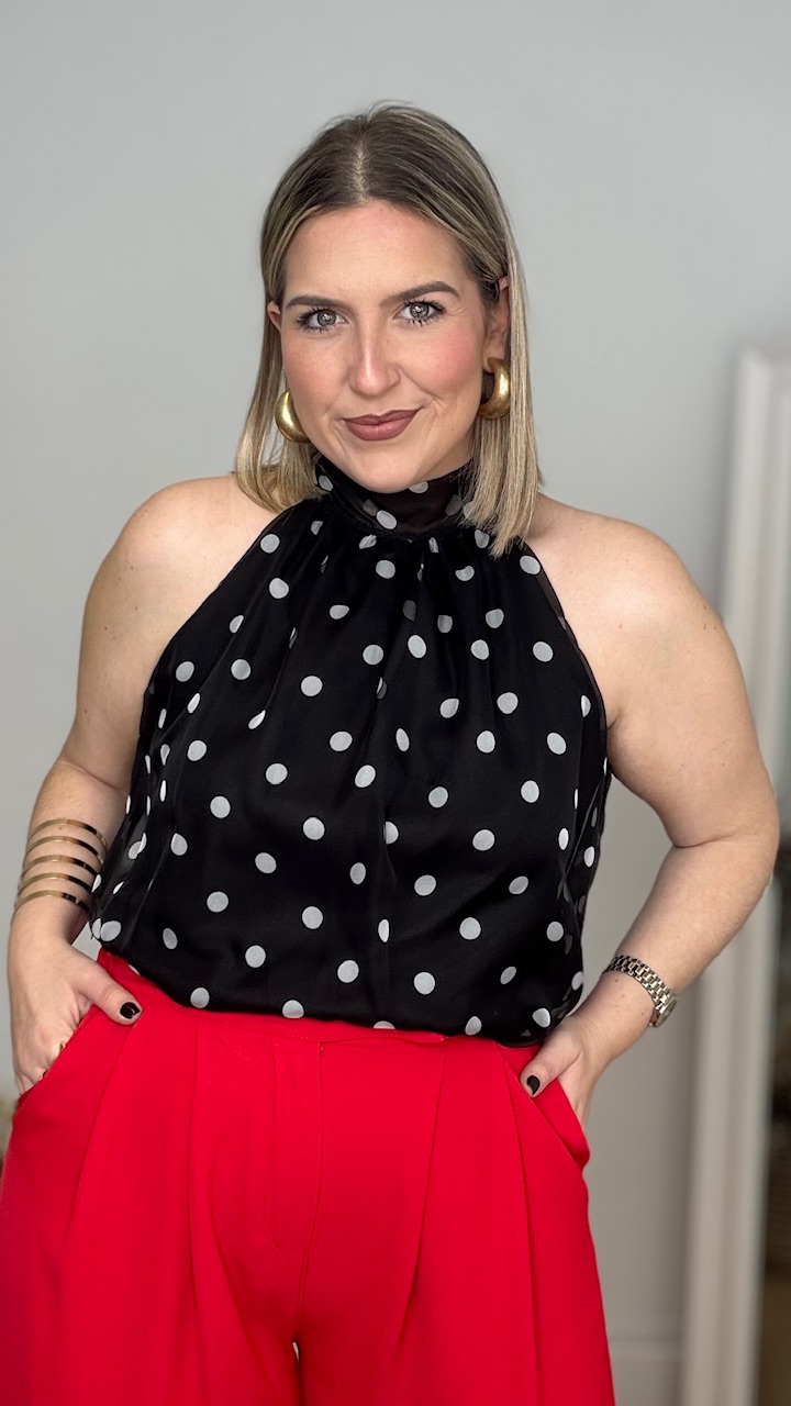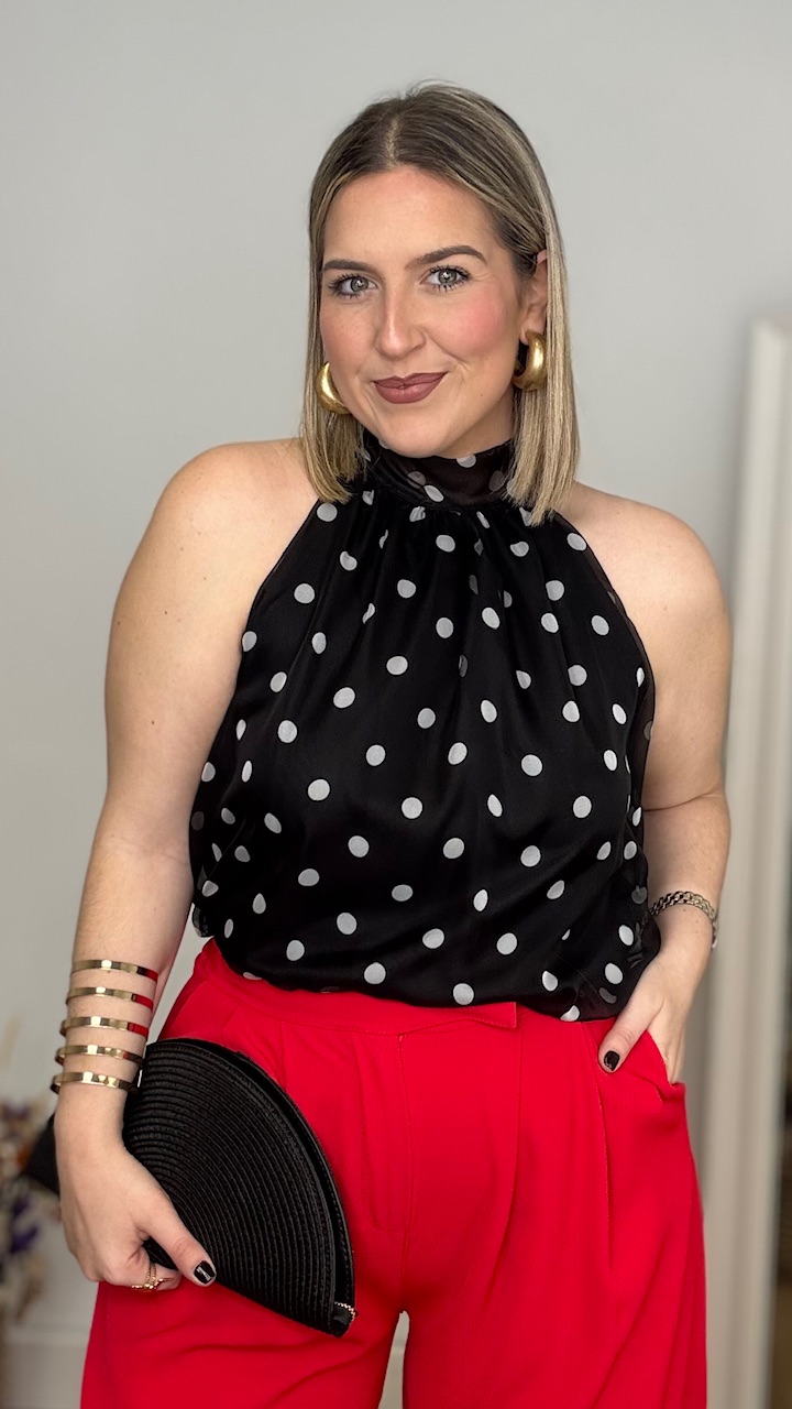 Top con cuello halter en color negro con lunares en blanco. Lleva forro en su interior.Talla única válida desde la talla 36 hasta la talla 42/44.