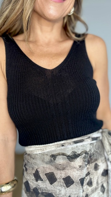 top confeccionado en tejido de punto con detalle en la parte delantera en color negro. Talla única válida desde la 36 hasta la 44.