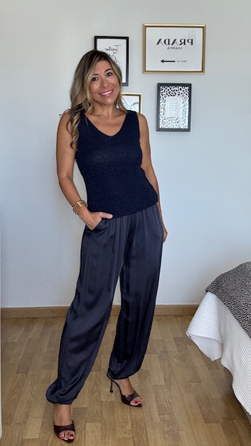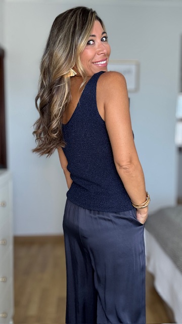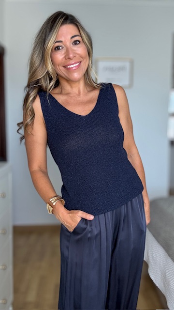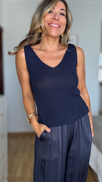 Top de hilo en color azul marino con detalle de brillo. Talla única válida desde la 36 hasta la talla 44.