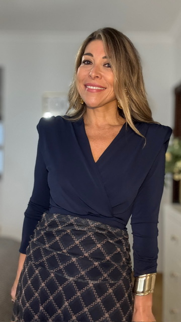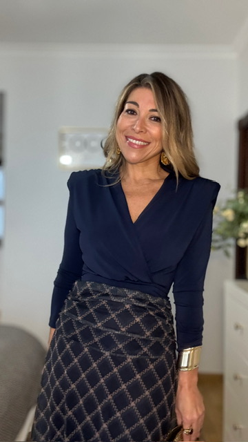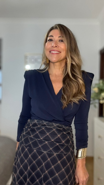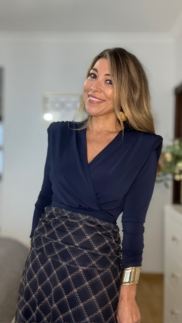 Top con hombreras con escote de pico y manga larga. Talla única válida desde la 36 hasta la 42.