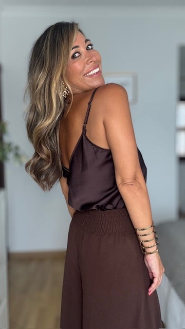 Top lencero doble encaje en color marrón chocolate en tejido satinado, lleva tiranta regulable y elástica. Talla única válida para tallas desde la 36 hasta la 40