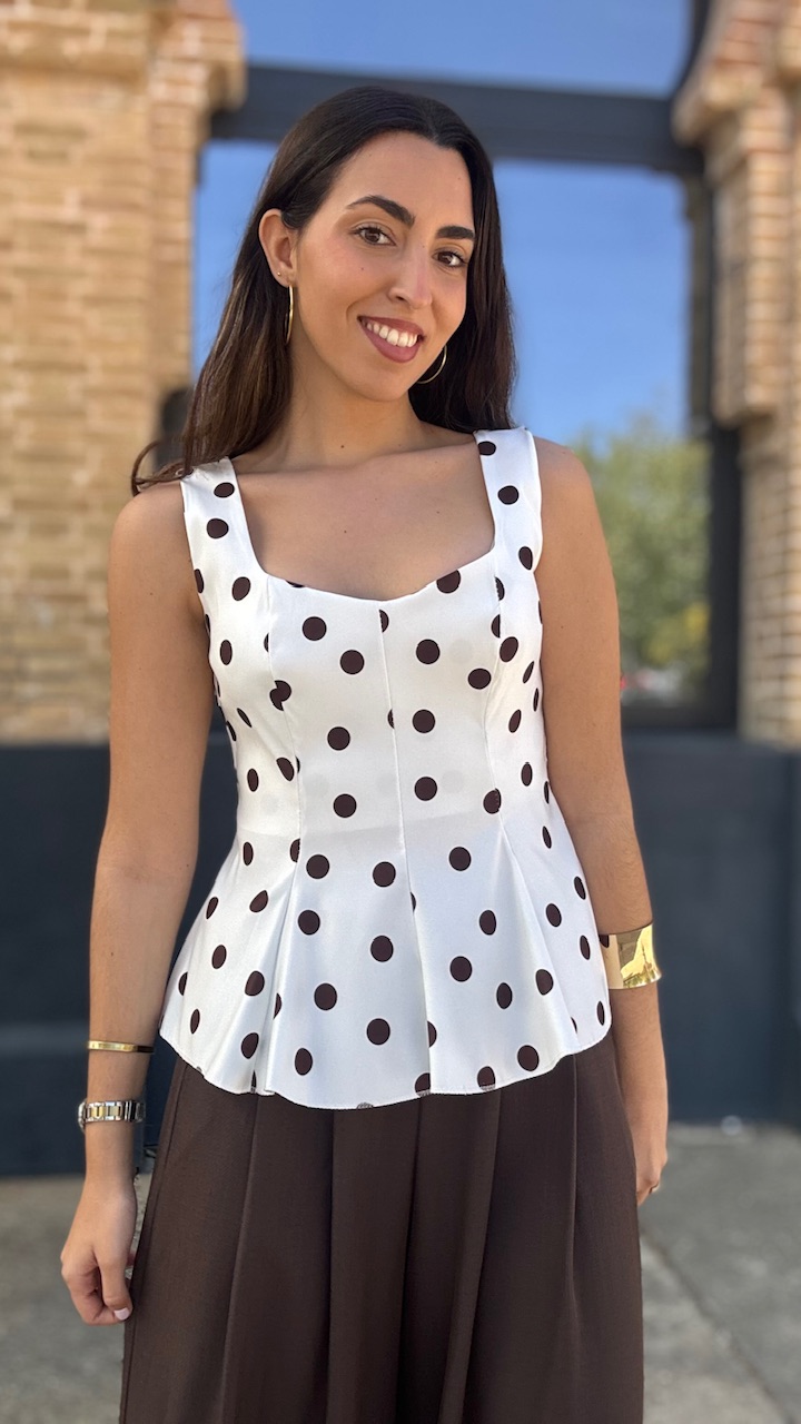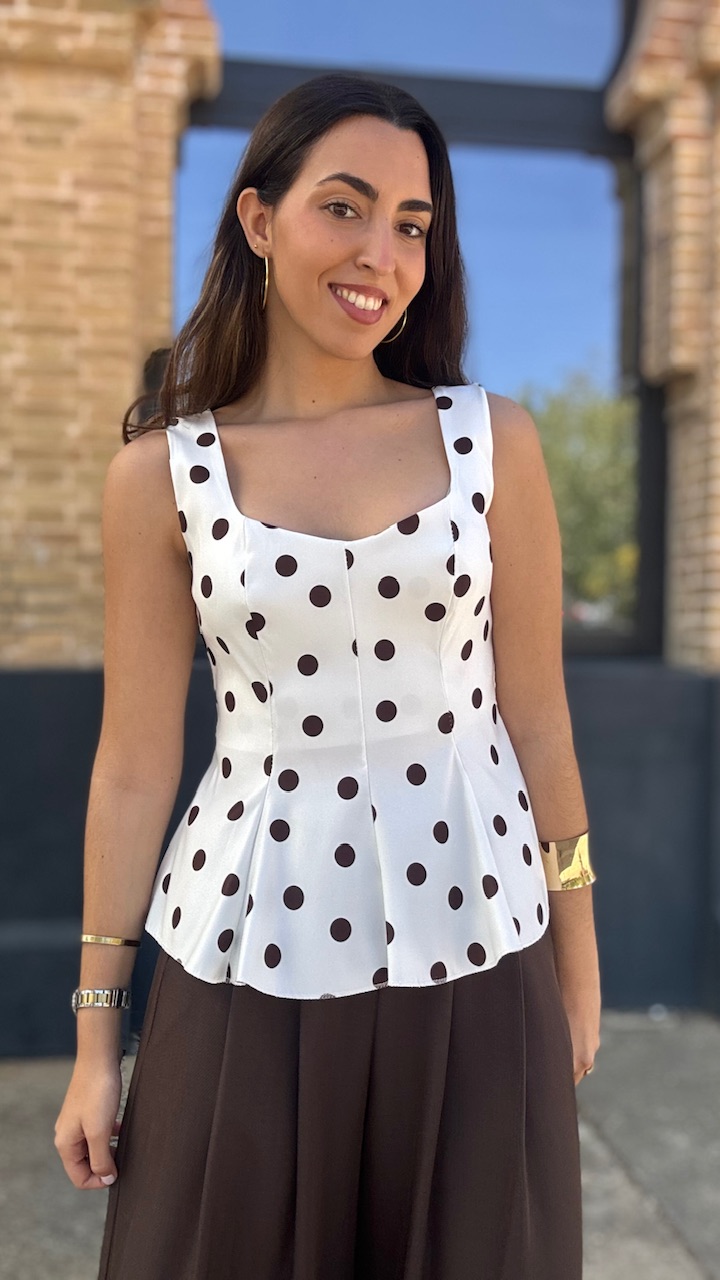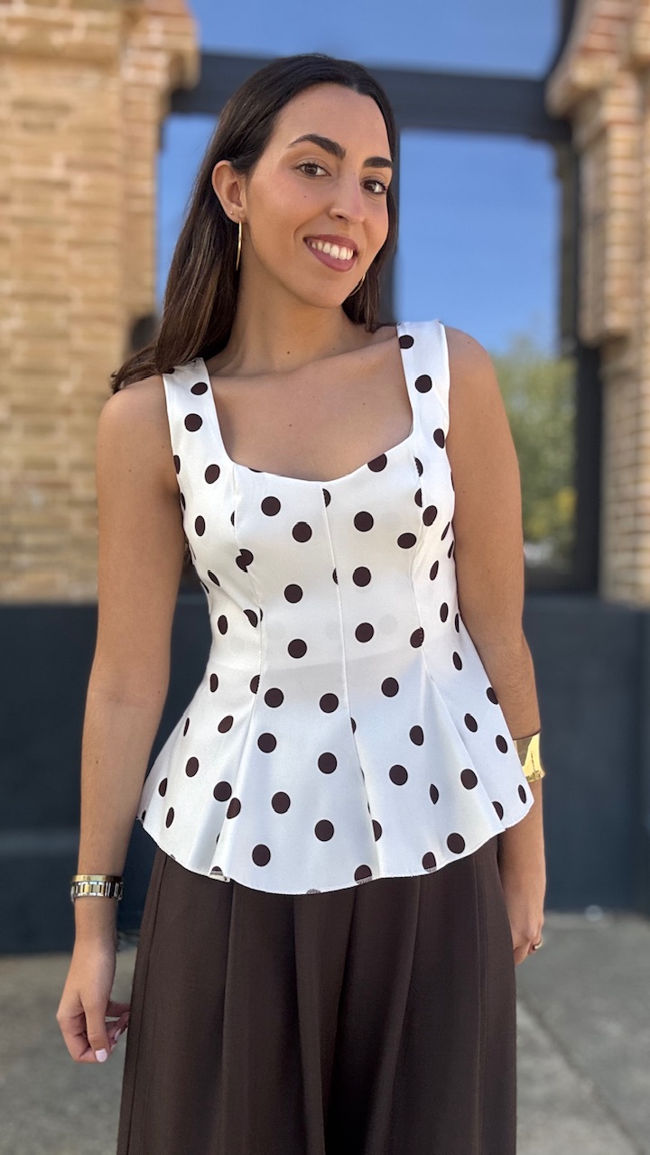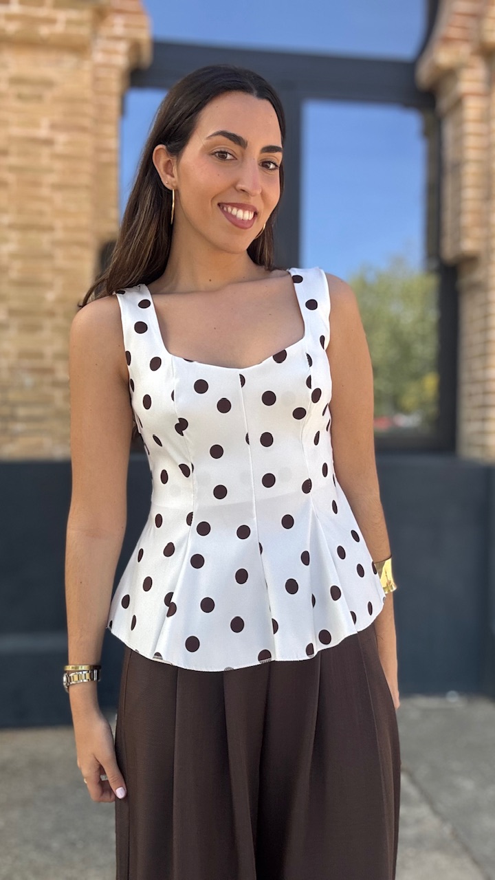 Top de tirantes en color blanco con lunares en color marrón. Lleva forro. Talla única válida desde la talla 36 hasta la talla 42/44.