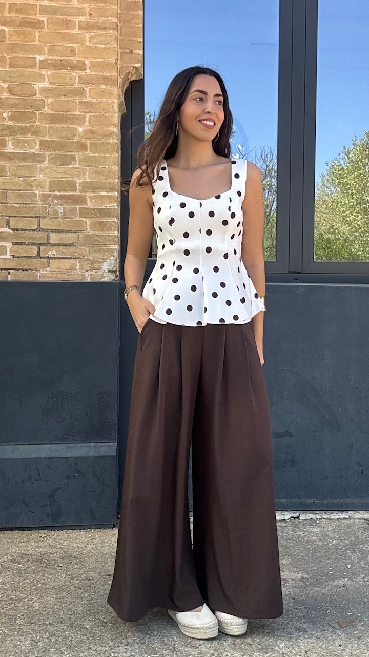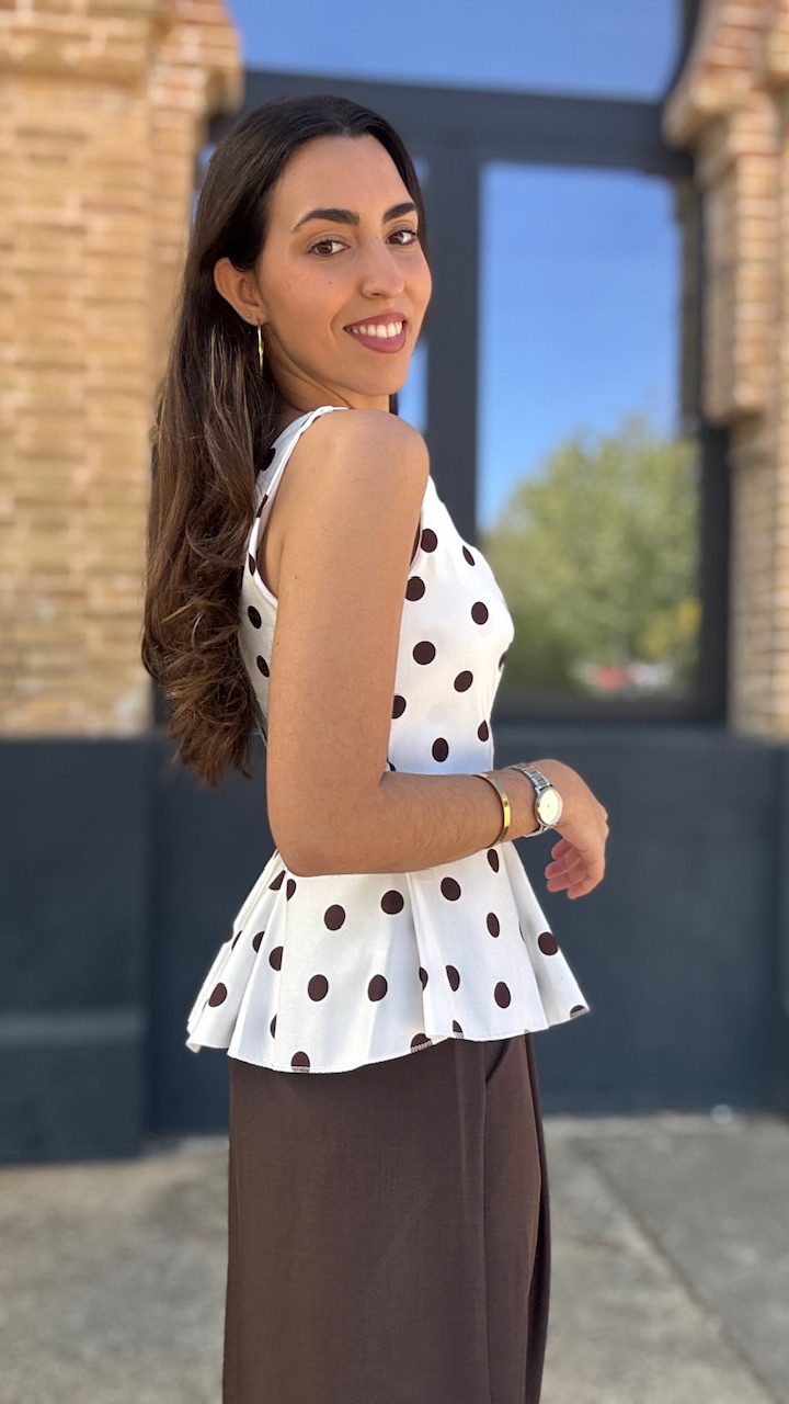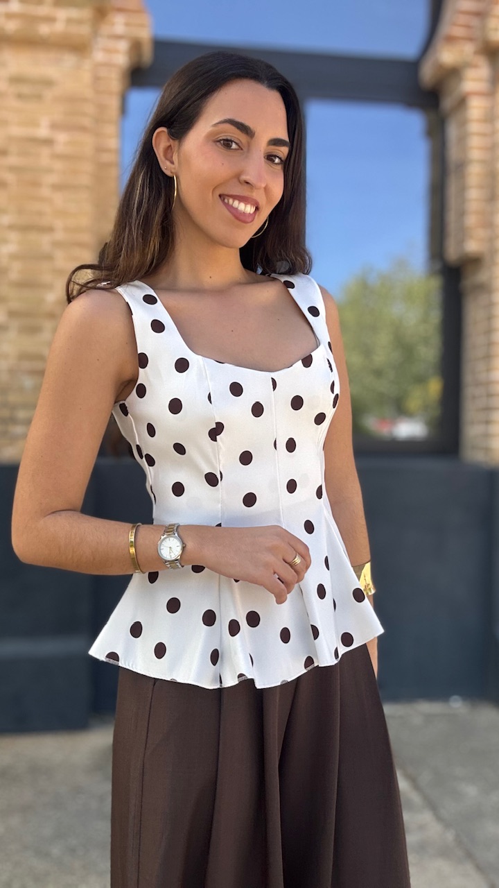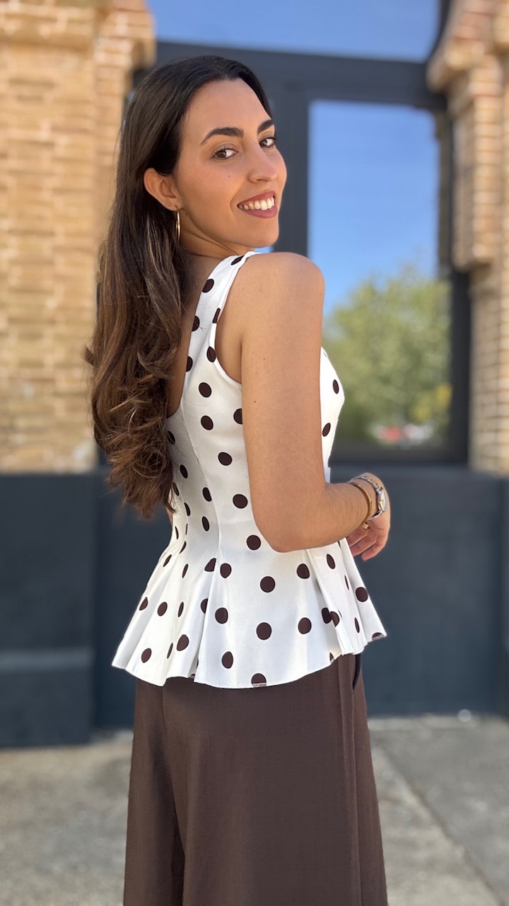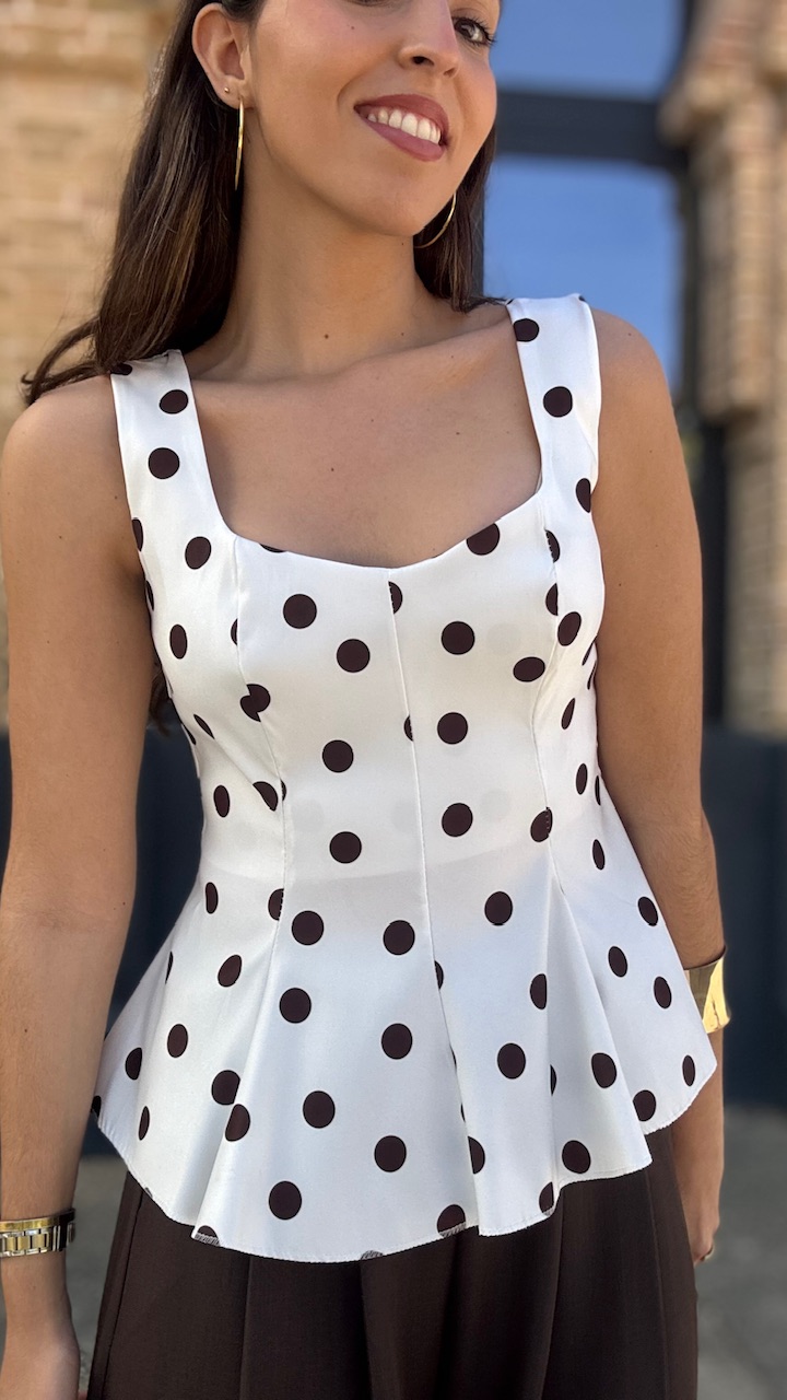 Top de tirantes en color blanco con lunares en color marrón. Lleva forro. Talla única válida desde la talla 36 hasta la talla 42/44.