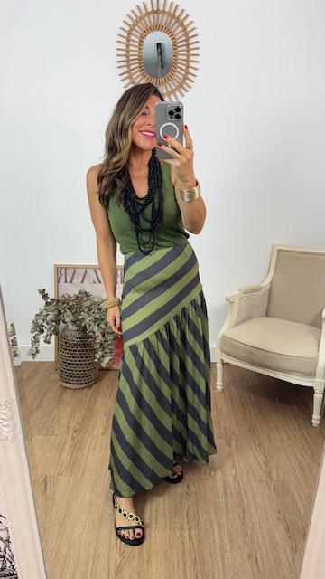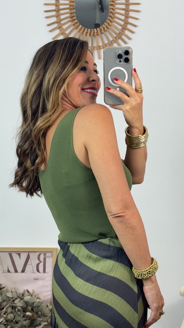 Top de tirantes en color caza confeccionado en tejido de punto. Talla única válida desde la 36 hasta la 40/42.