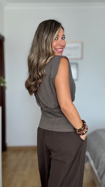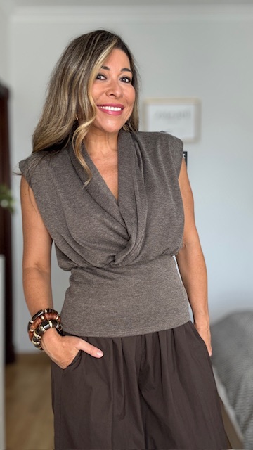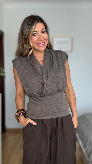 Top de punto en color marrón jaspeado con escote en V cruzado. Cadera entallada a modo de fajín. Talla única válida desde la 36 hasta la 40/42.