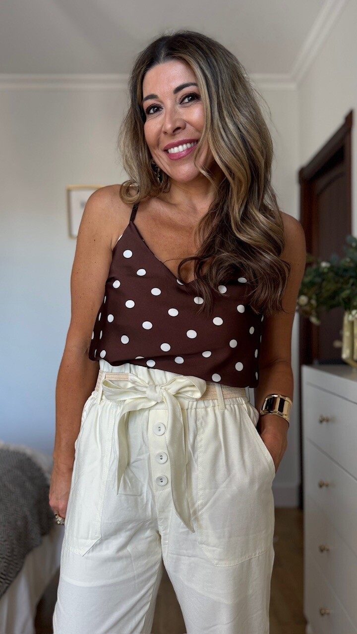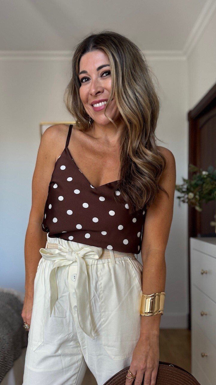 Top satinado con tirantas regulables en color marrón con lunares en color blanco. Talla única válida desde la talla 36 hasta la talla 42/44.