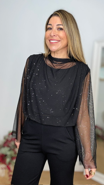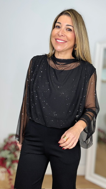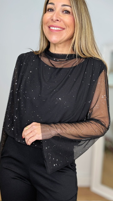 Top de tul con brillo en color negro. Lleva forro incluido en su interior. Talla única válida desde la 36 hasta la 44.