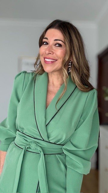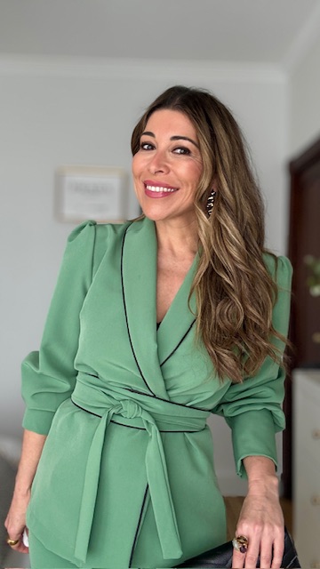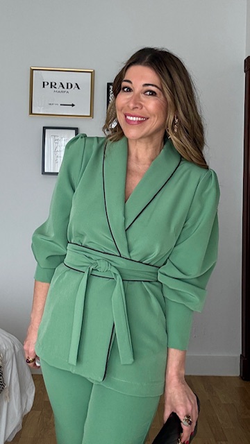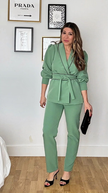 Traje de chaqueta en color verde manzana, compuesto por chaqueta con diseño cruzado, mangas abullonadas y cinturón del mismo tejido. Los pantalones son de corte recto y cremallera en la parte izquierda. Talla única válida desde la 36 hasta la talla 40.