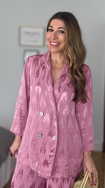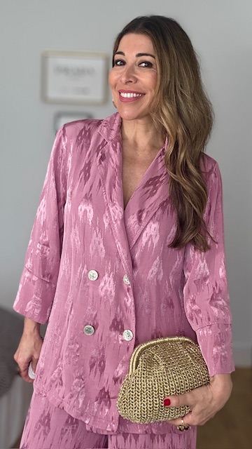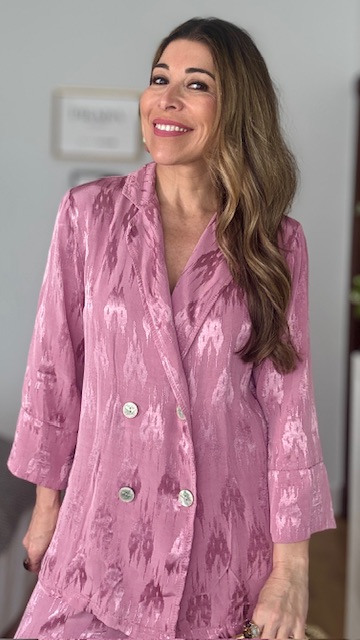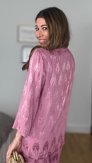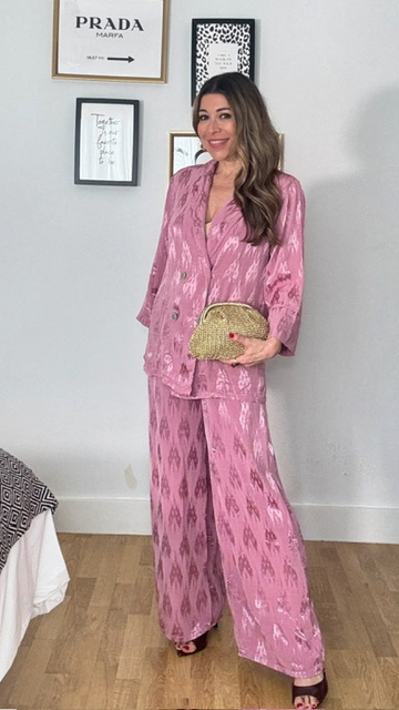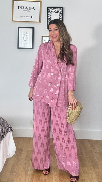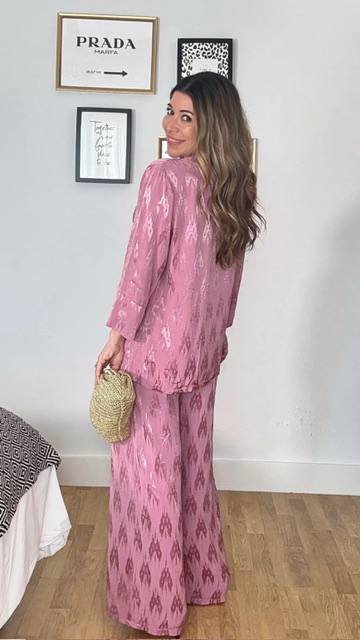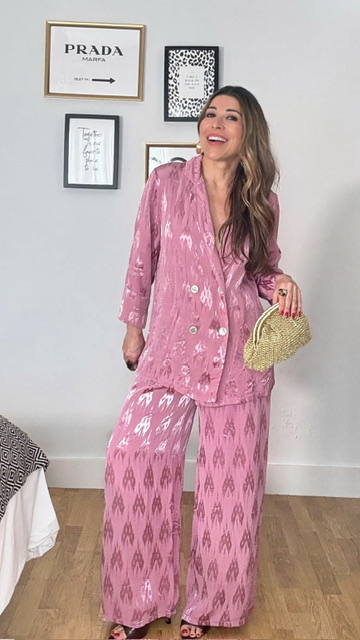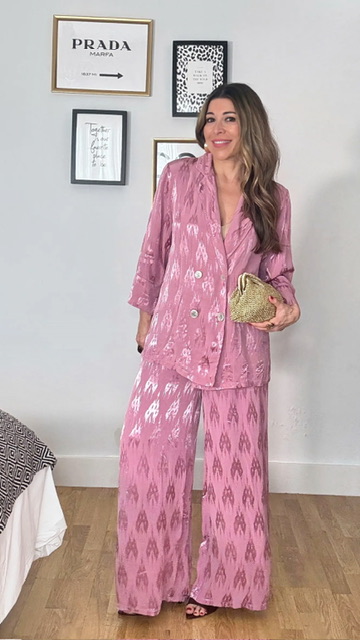 Traje de chaqueta confeccionado en tejido de satén con estampado en color rosa maquillaje. Compuesto por chaqueta cruzada y pantalón de tiro alto con cinturilla elástica y pata ancha. Talla única válida desde la 36 hasta la talla 42.