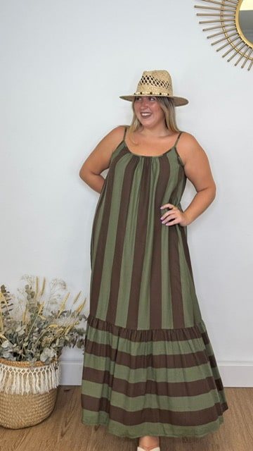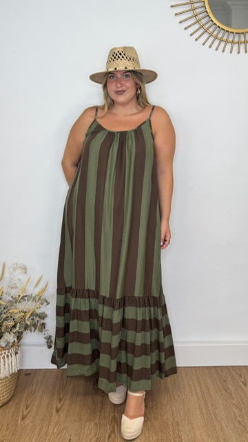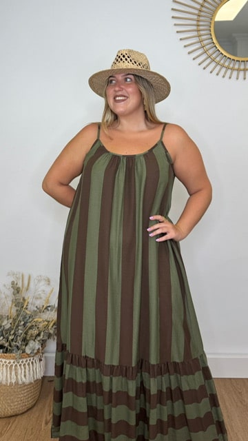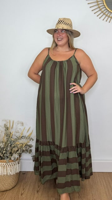 Vestido confeccionado en tejido de viscosa con estampado de rayas en caza. Talla única válida desde la 36 hasta la 44.