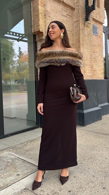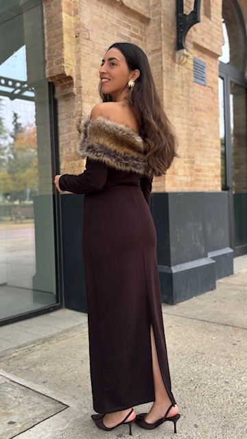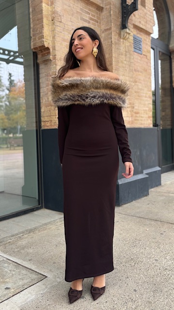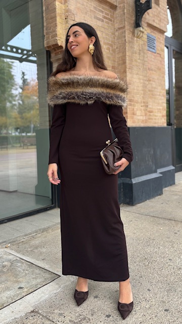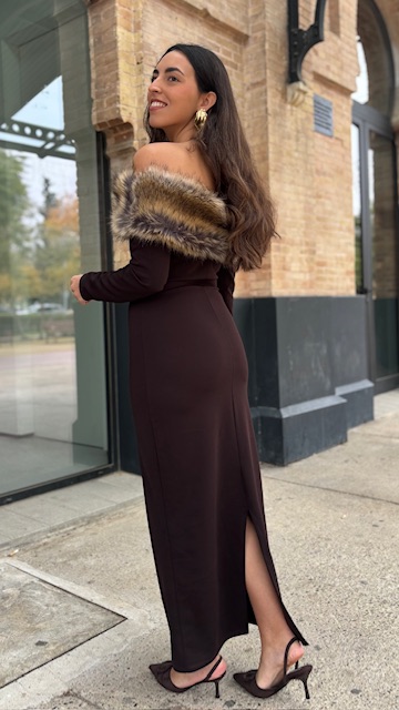 Vestido de crepé elástico con hombros al descubierto con pelo sintético en color marrón Talla única válida desde la 36 hasta la 40.