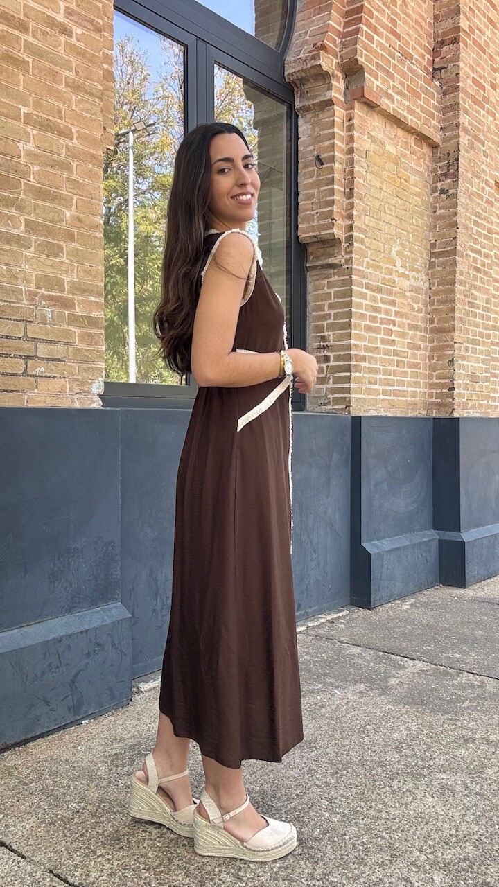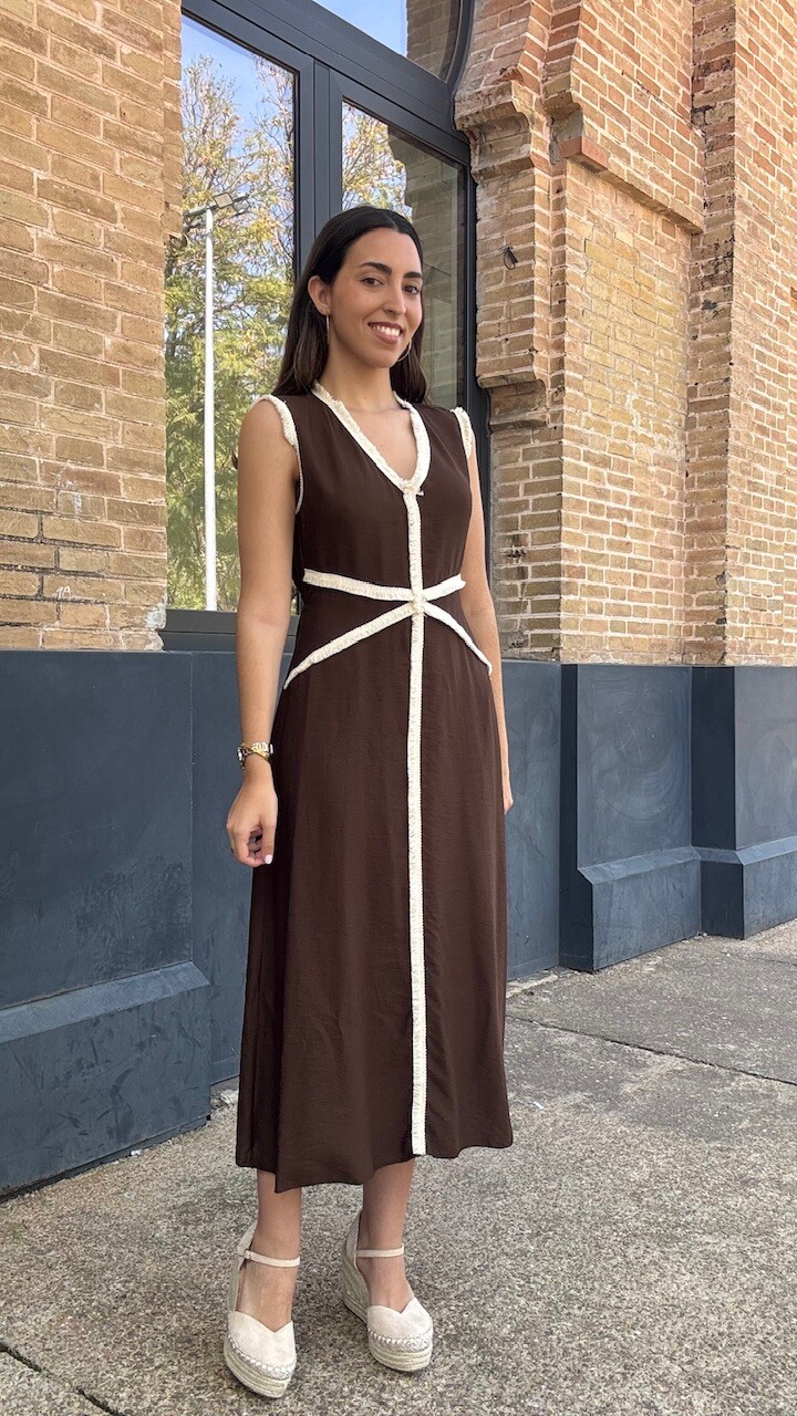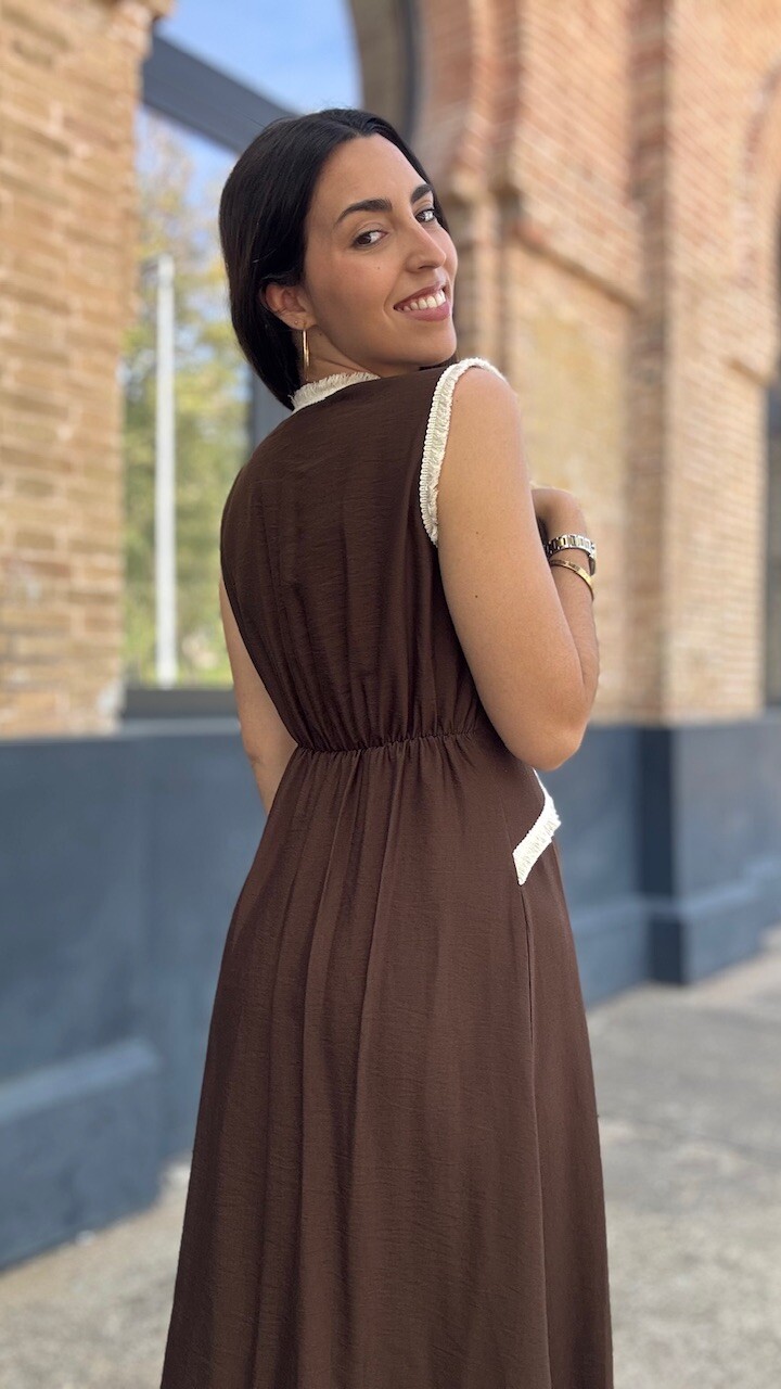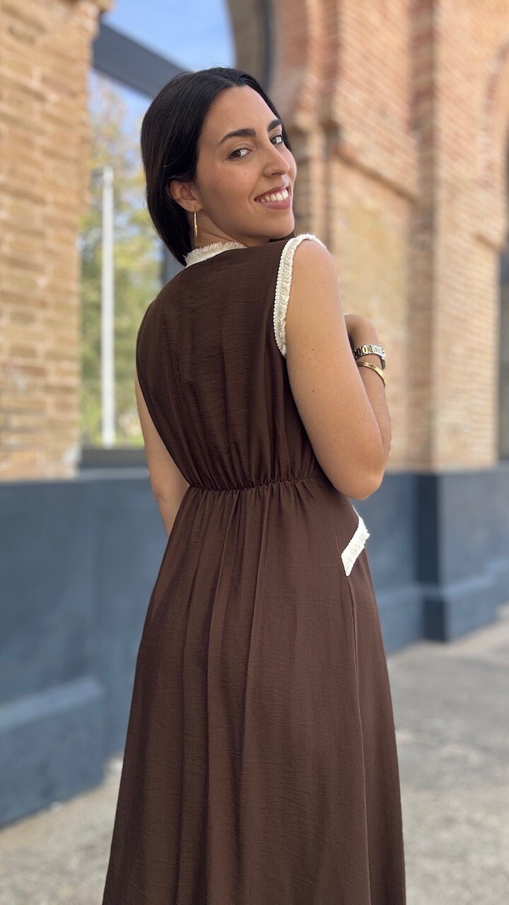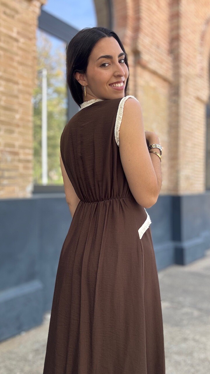 Vestido midi con mangas a la sisa y cinturilla elástica en la parte trasera en color marrón con ribetes de flecos cortos en color beige. Talla única válida desde la talla 36 hasta la talla 42.