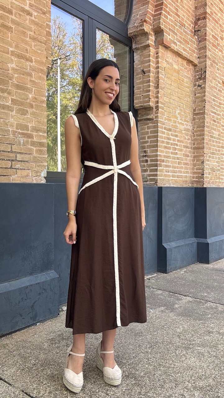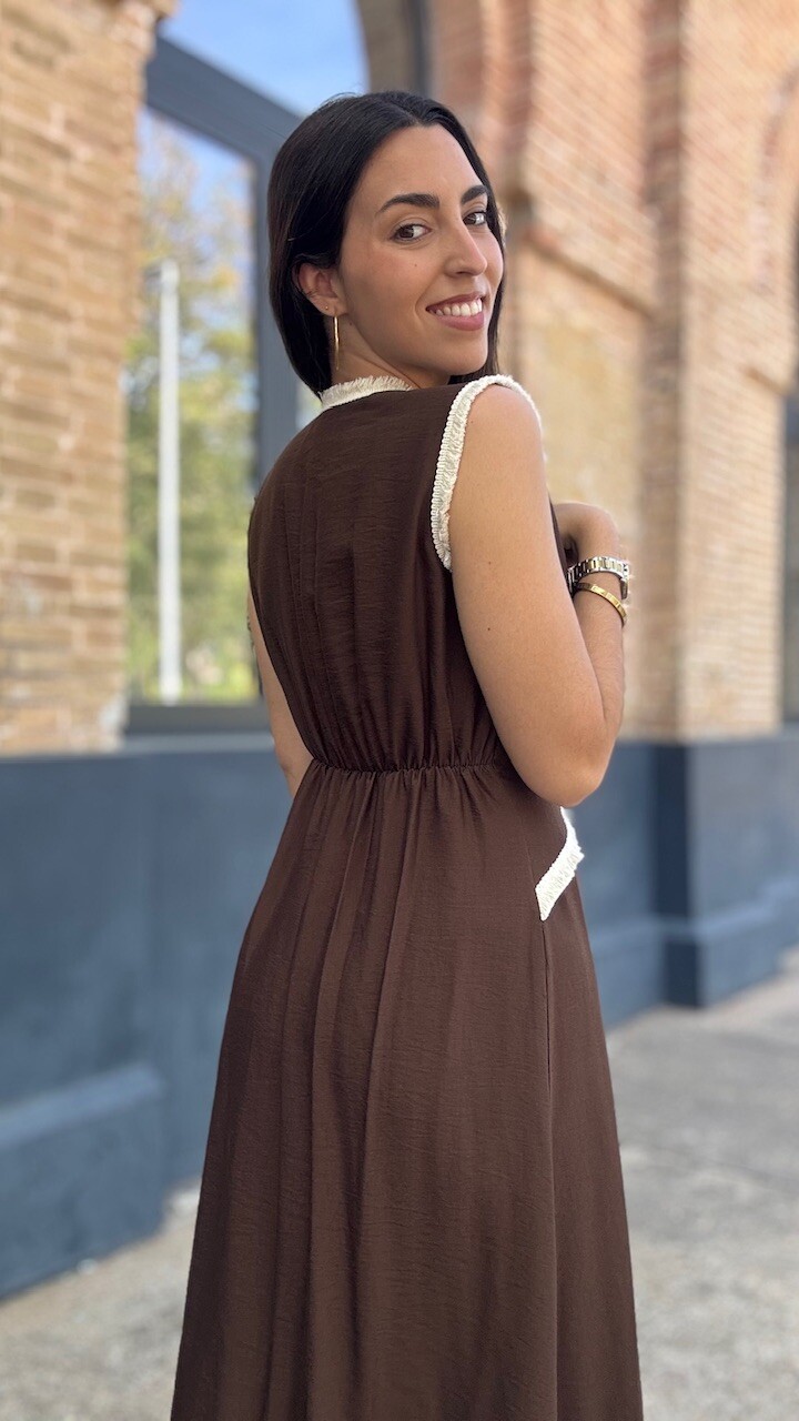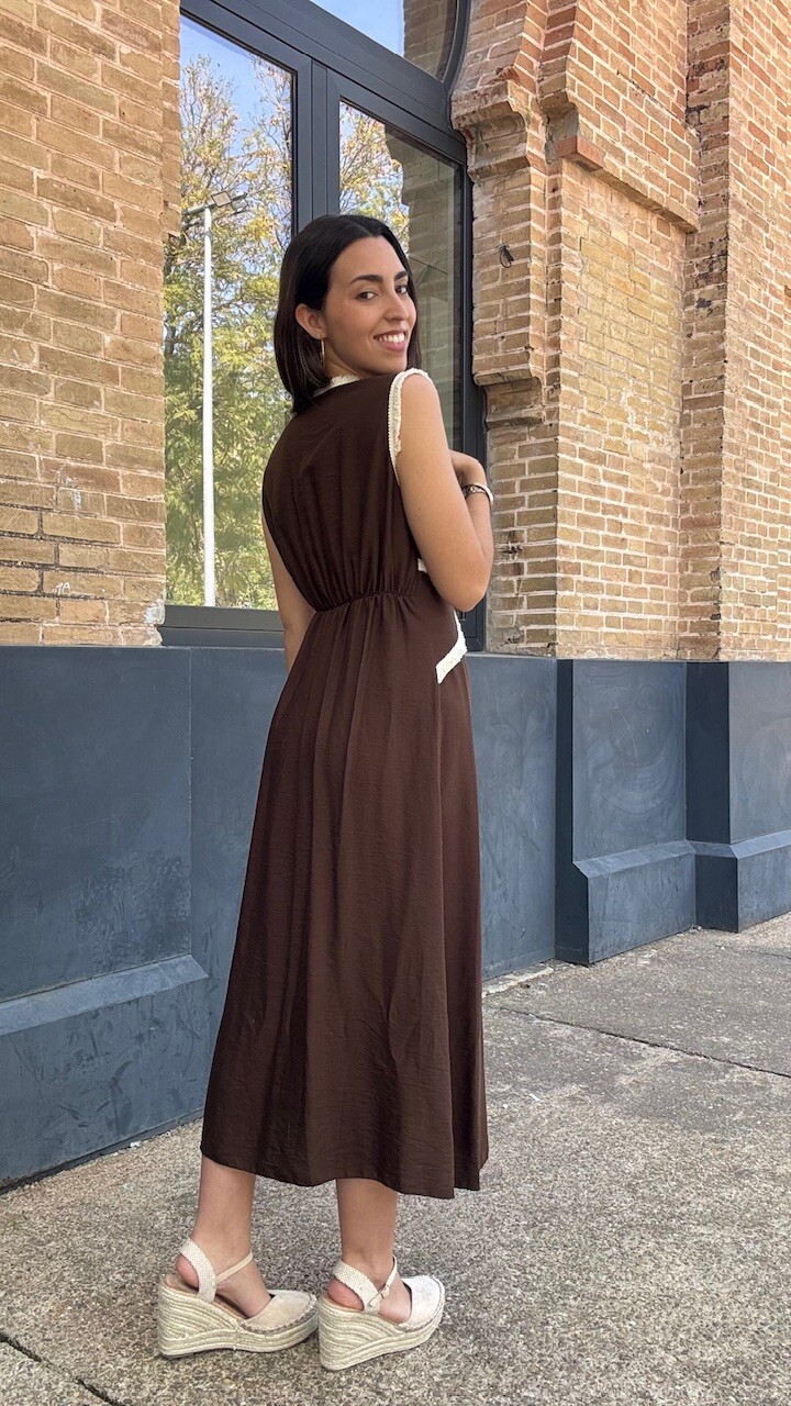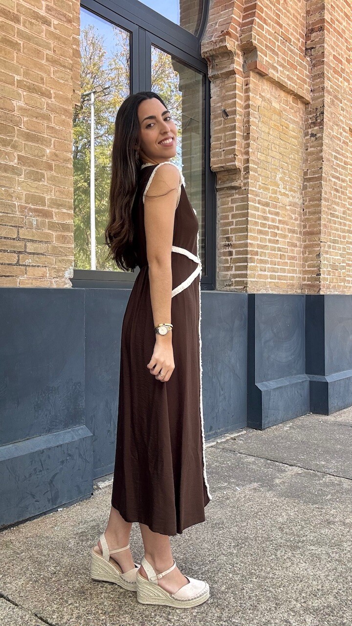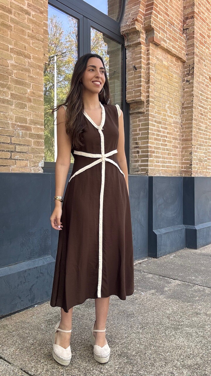 Vestido midi con mangas a la sisa y cinturilla elástica en la parte trasera en color marrón con ribetes de flecos cortos en color beige. Talla única válida desde la talla 36 hasta la talla 42.
