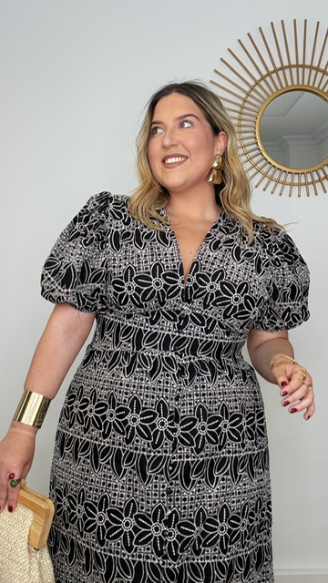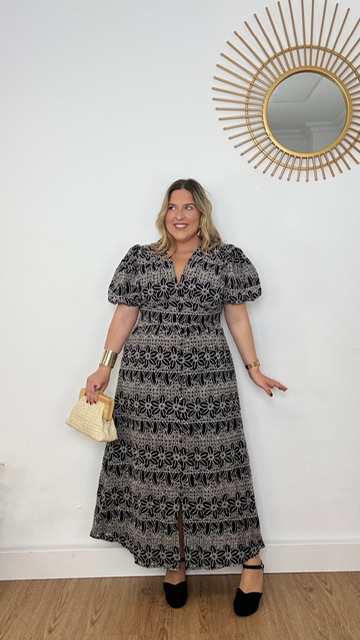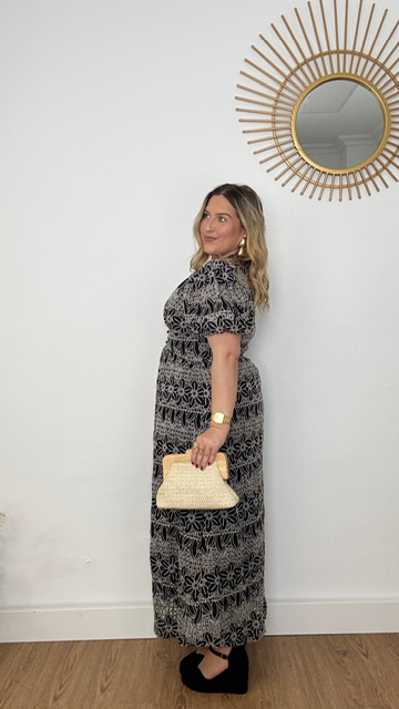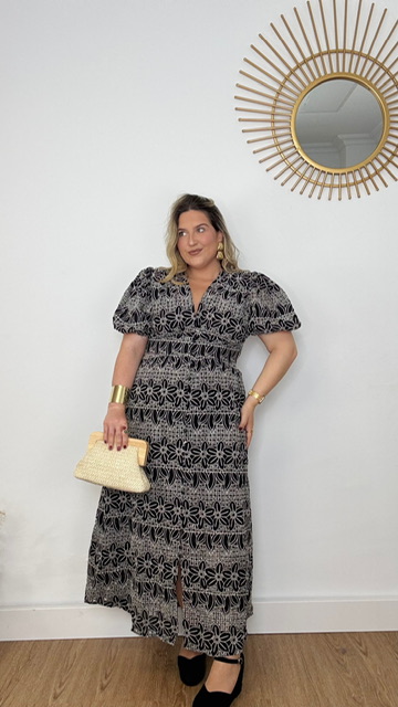 Vestido en color negro tipo midi perforado con bordados en color blanco. Disponible por tallas.