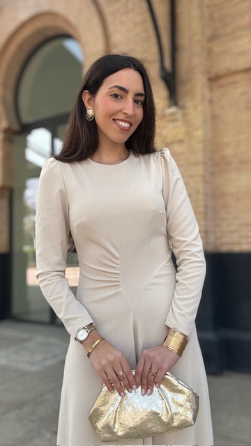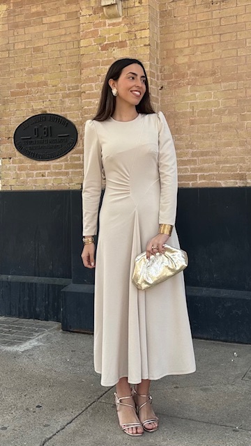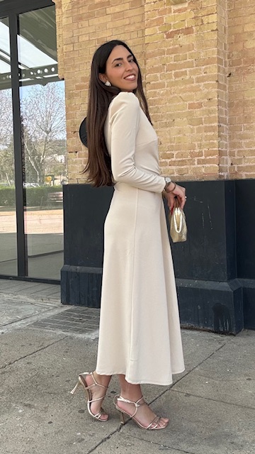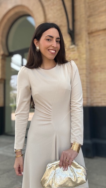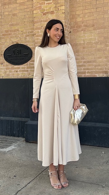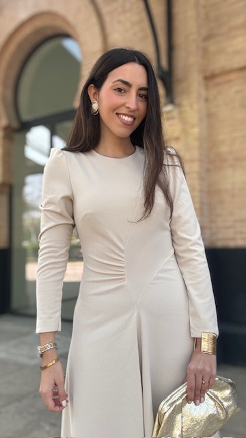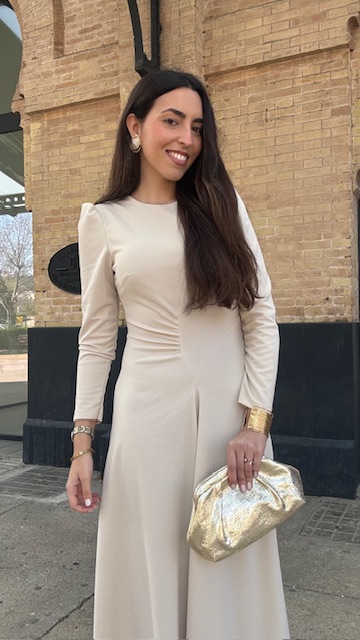 Vestido de invitada midi con falda de capa con mangas abullonadas en color beige. Talla única válida desde la 36 hasta la 42/44.