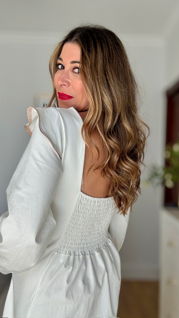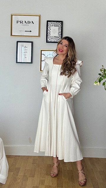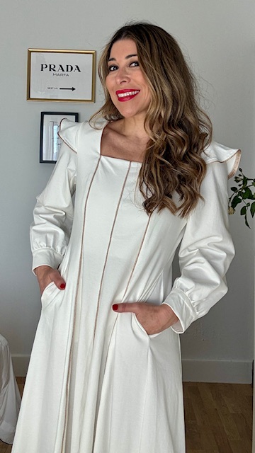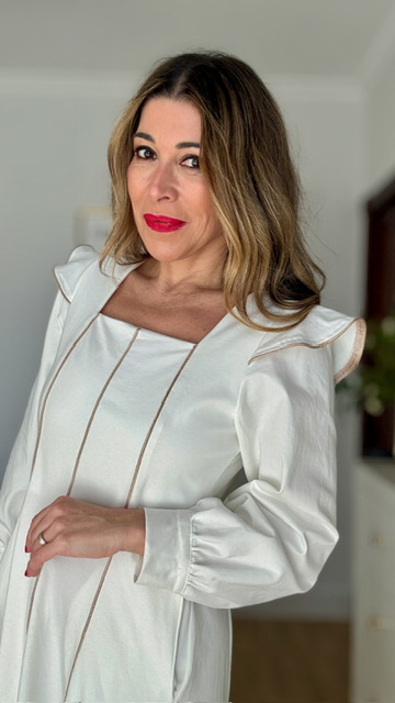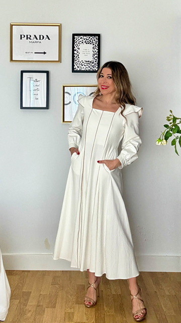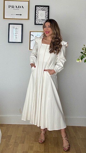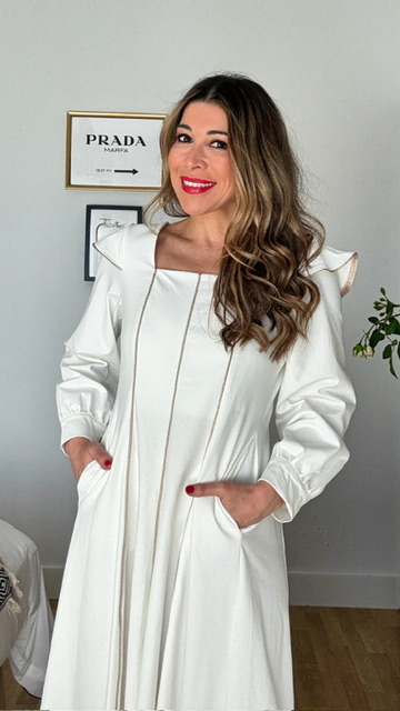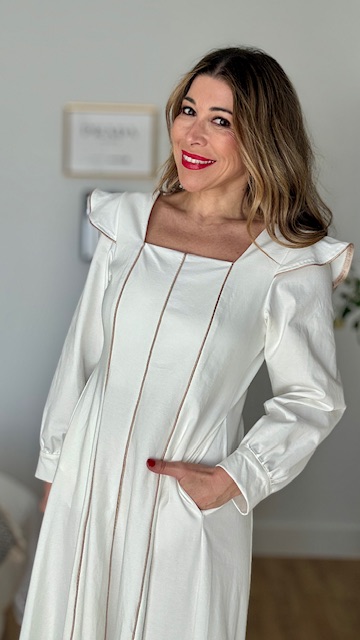 Vestido de invitada de largo mido en color beige y ribeteado en tono camel. Lleva bolsillos y escote cuadrado con nido de abeja en la espalda. Manda larga con botín en puño. Está confeccionado en tejido con elástano. Talla única válida desde la talla 38 hasta la 44.