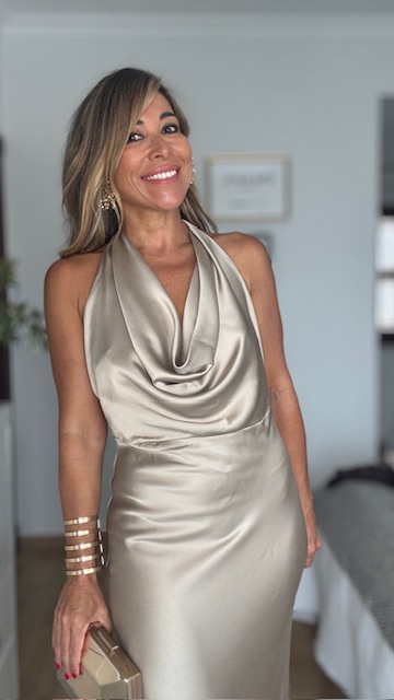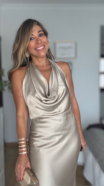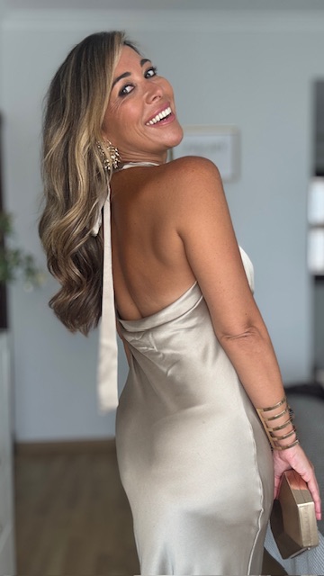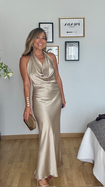 Vestido confeccionado en tejido satinado en un precioso color champan con espalda infinita descubierta y lazada en el cuello. Vestido largo ideal para cualquier evento de noche o graduación. Talla única válida desde la 36 hasta la 42. No lleva elastano.