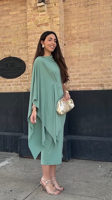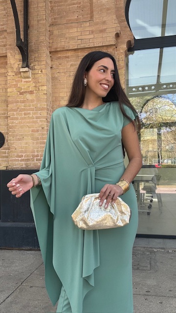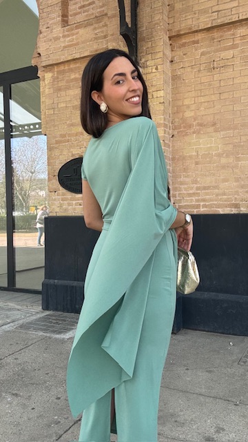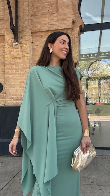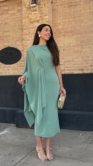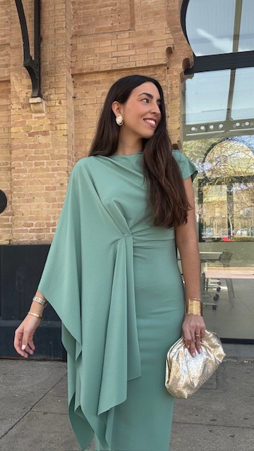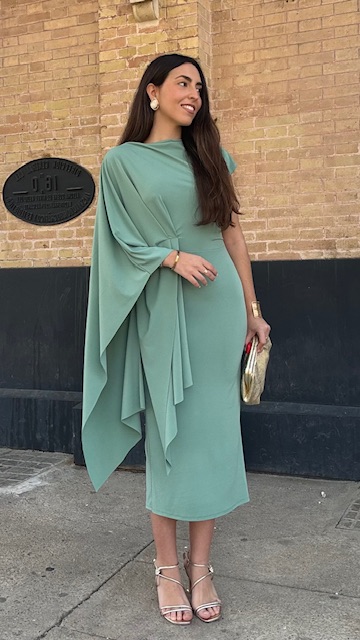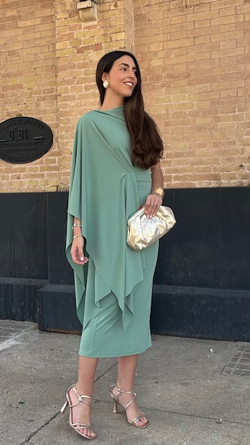 Vestido de invitada midi con capa en color verde jabonoso. Talla única válida desde la 36 hasta la 40/42.
