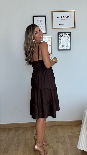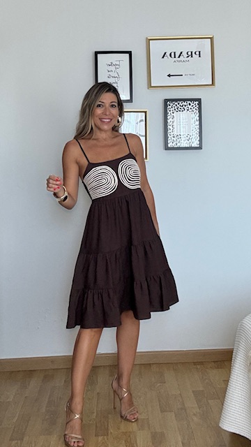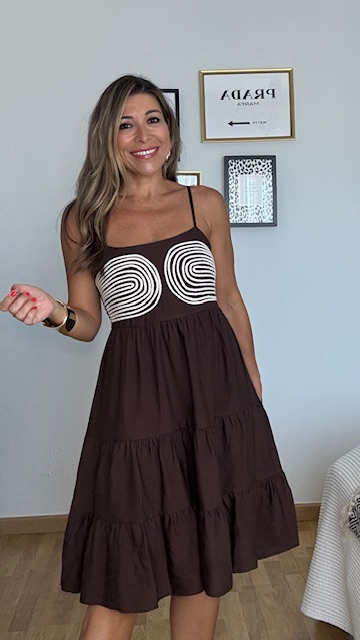 Vestido de corte evasé con falda tipo canastero con detalle de cordoncillo en el pecho. Nido de abeja en la espalda con tirantas elásticas y regulables. Talla única válida desde la 36 hasta la 42.
