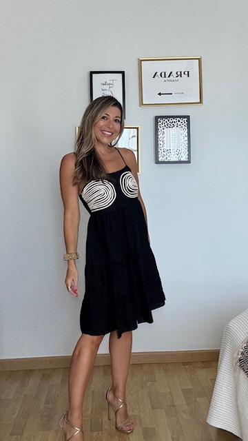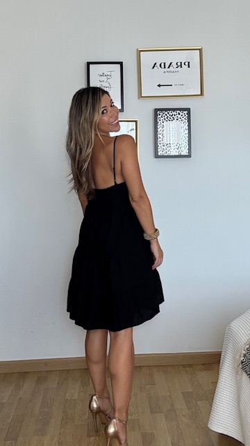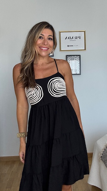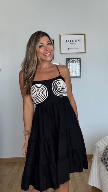 Vestido de corte evasé con falda tipo canastero con detalle de cordoncillo en el pecho. Nido de abeja en la espalda con tirantas elásticas y regulables. Talla única válida desde la 36 hasta la 42.