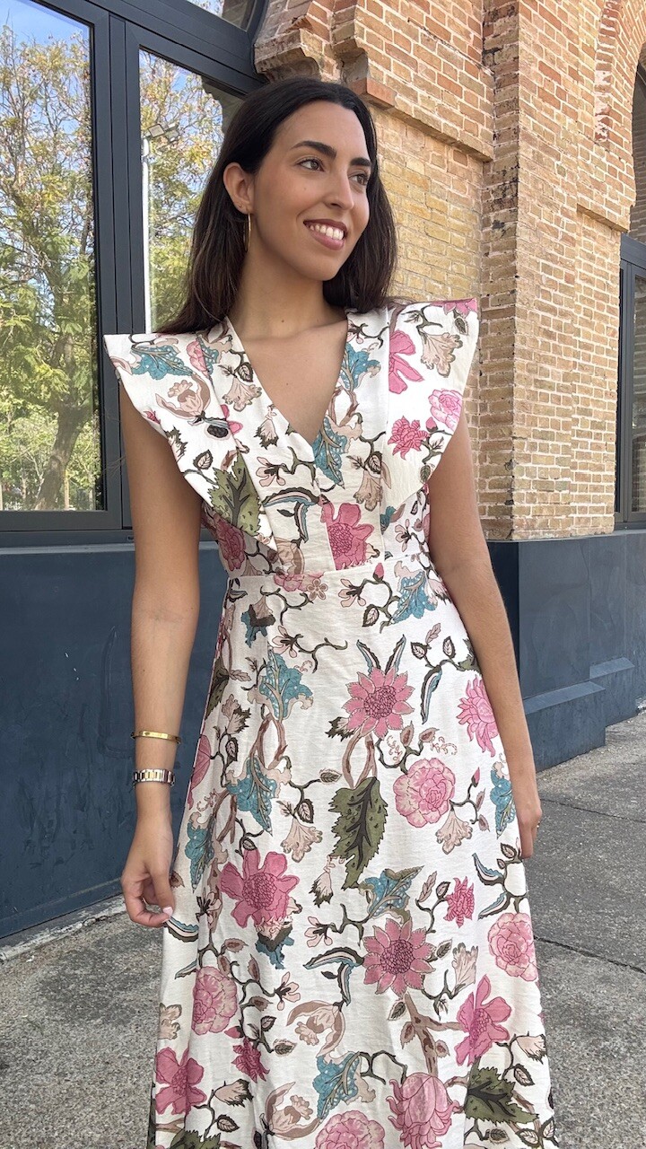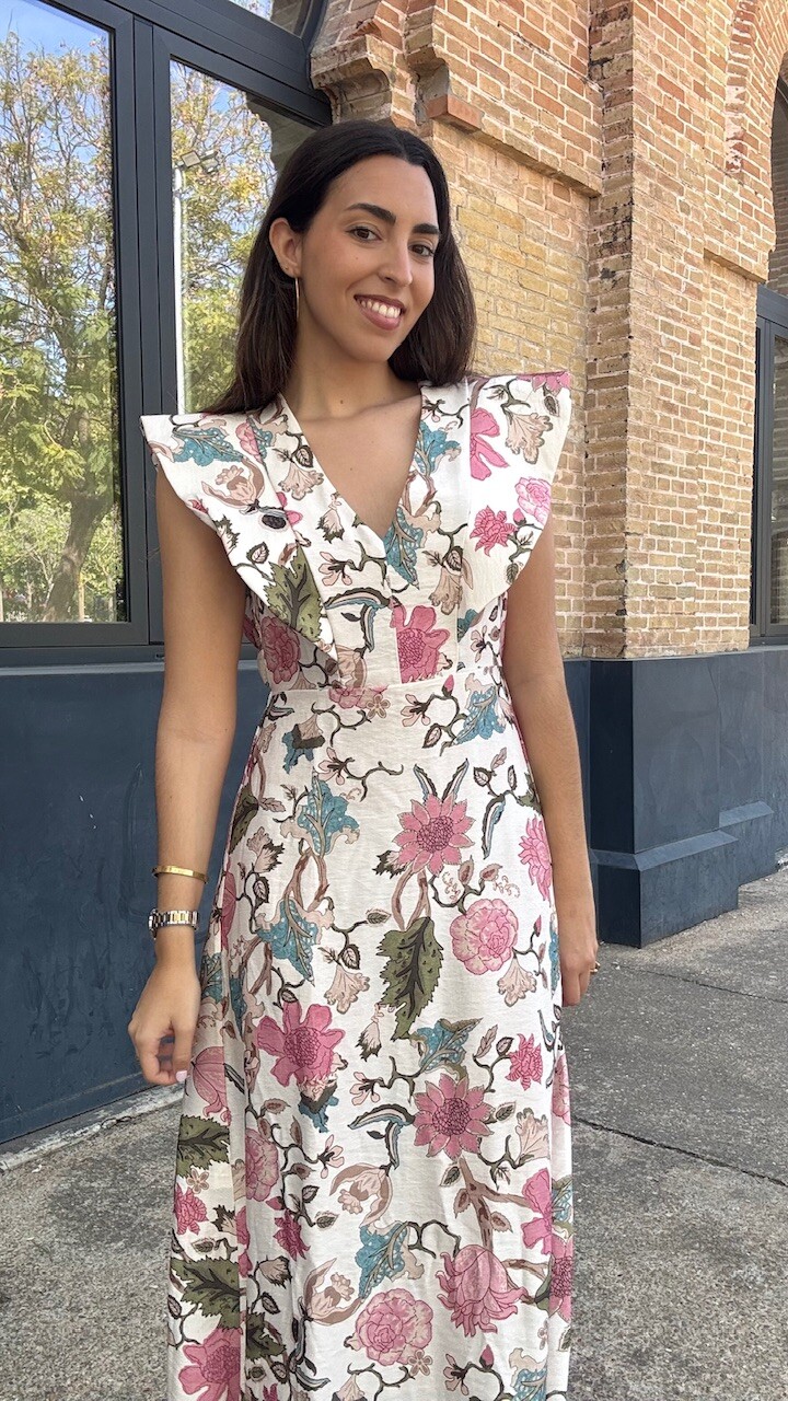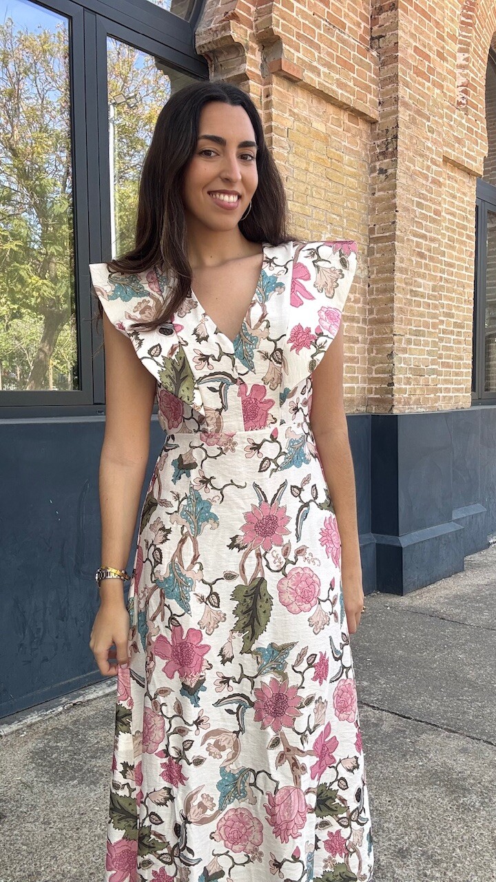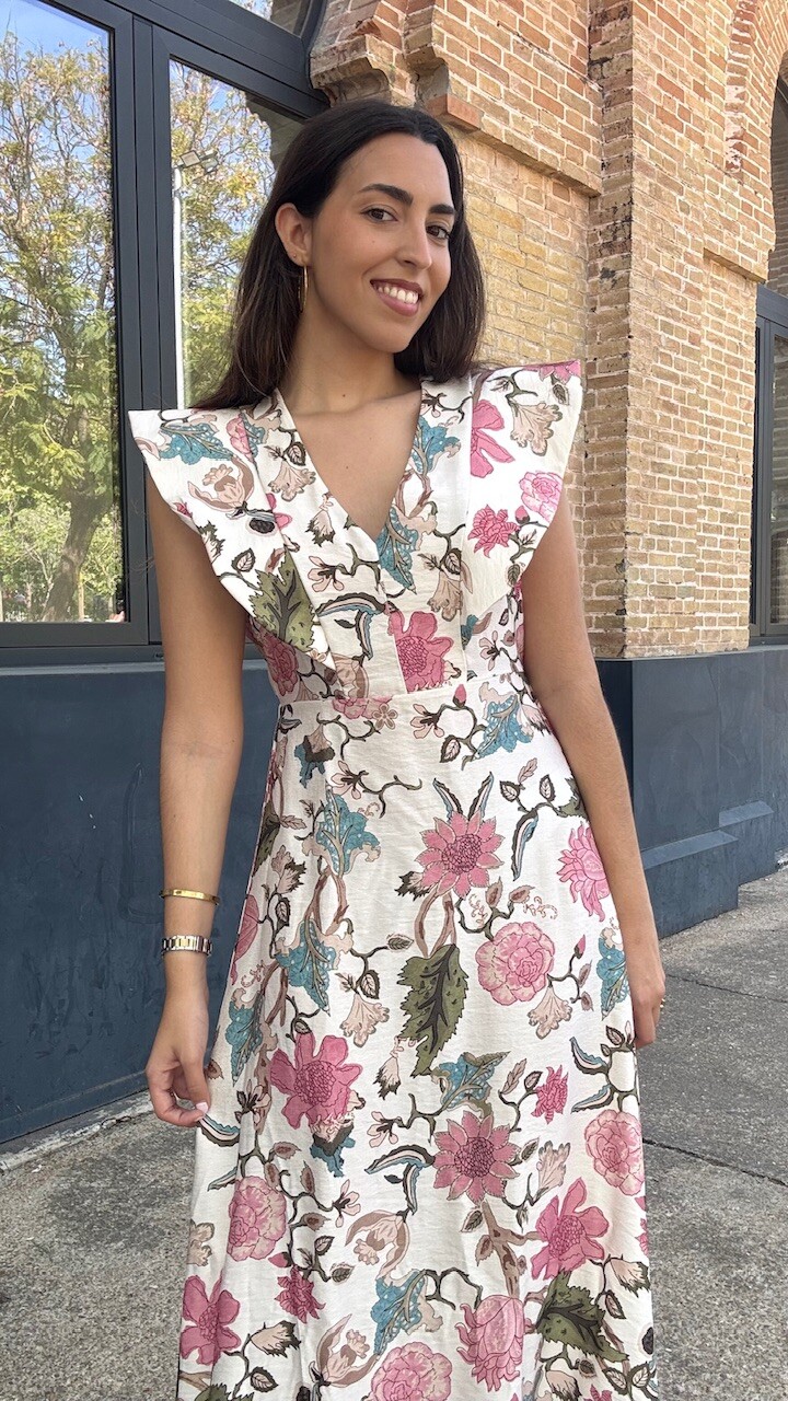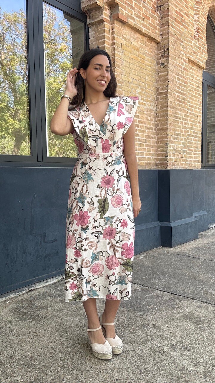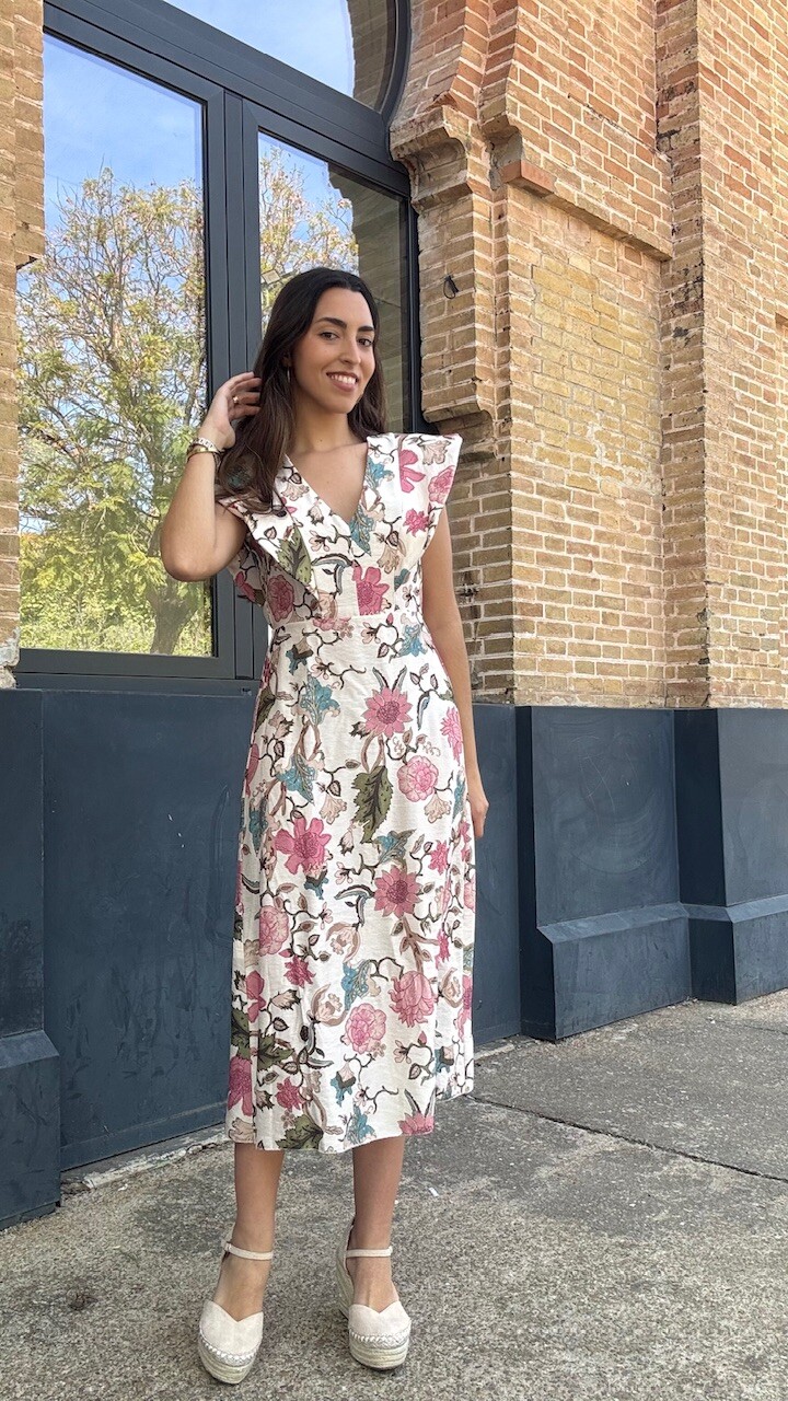 Vestido midi con mangas a la sisa y cinturilla elástica con estampado de flores. Talla única válida desde la talla 36 hasta la talla 42.