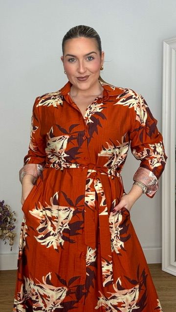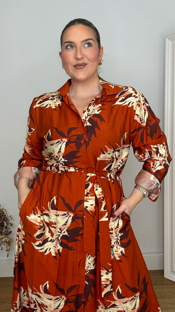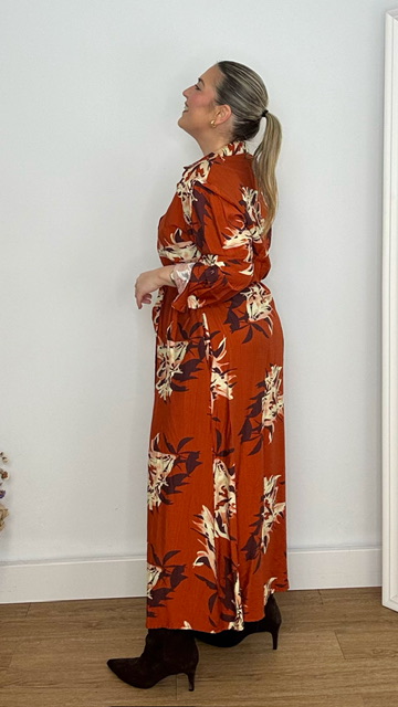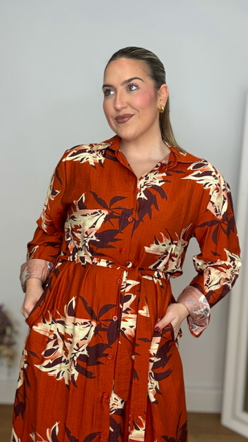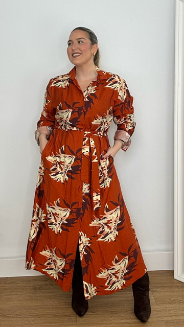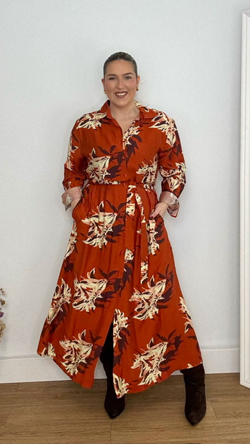 Vestido camisero con botonadura delantera con estampado de flores en color teja. Disponible por tallas.