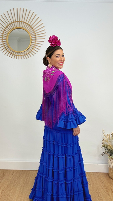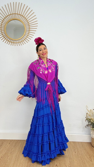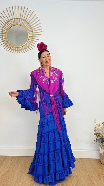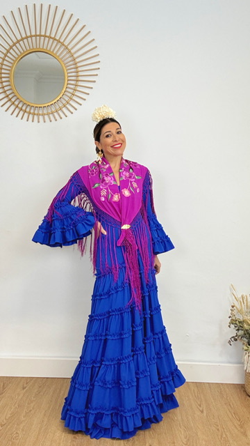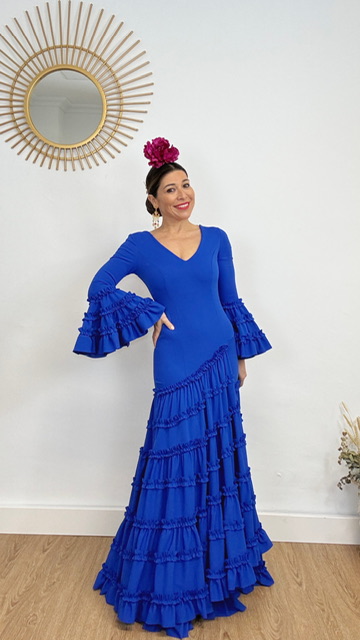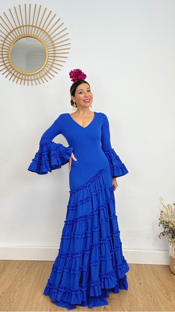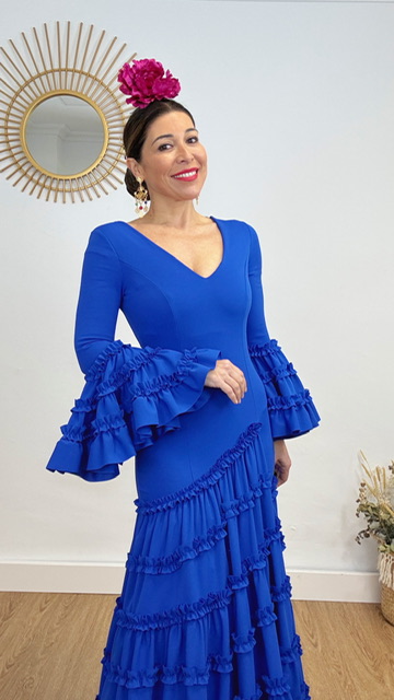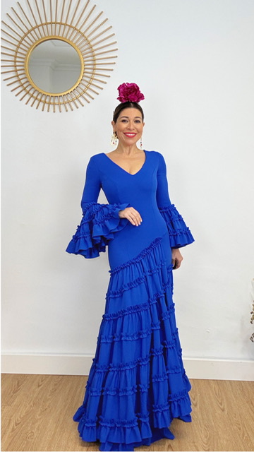 Vestido flamenca confeccionado en tejido de crepé elástico en color azul klein. Disponible por tallas que se adaptan muy bien al cuerpo.