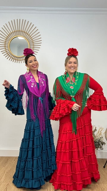 Vestido de flamenca confeccionado en tejido de crepé elástico en color petróleo. Disponible por tallas que se adapta muy bien al ser tejido elástico.