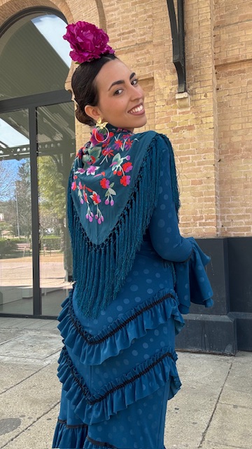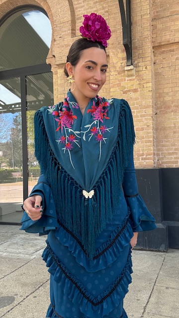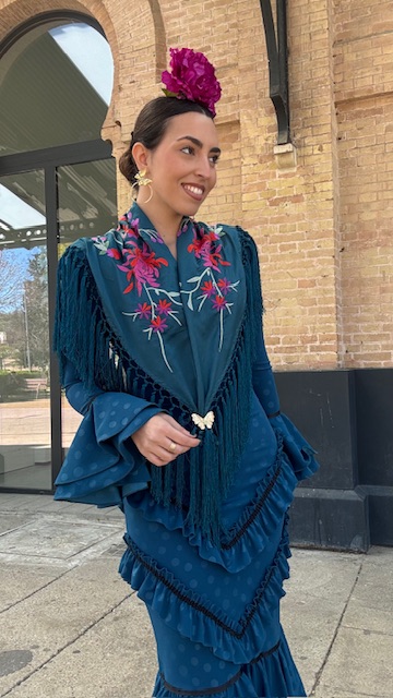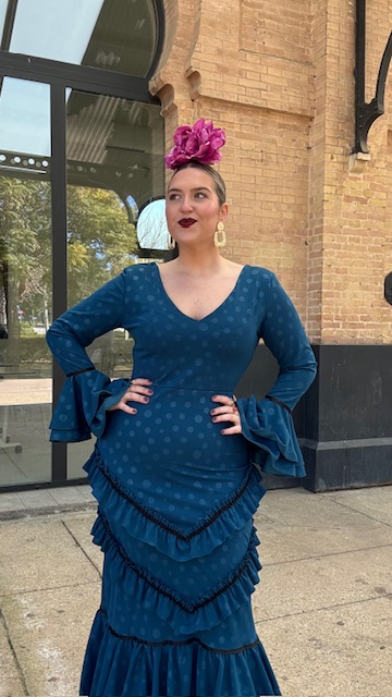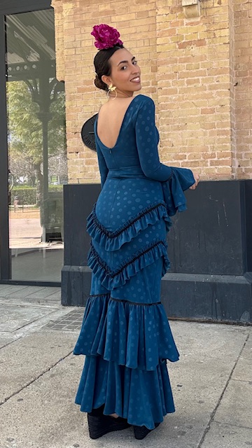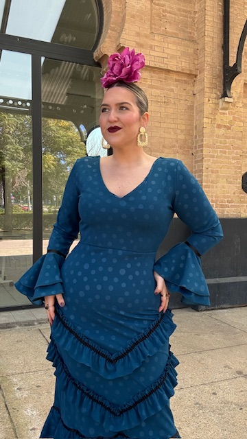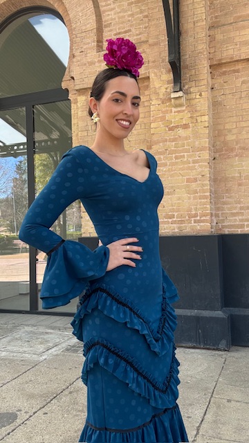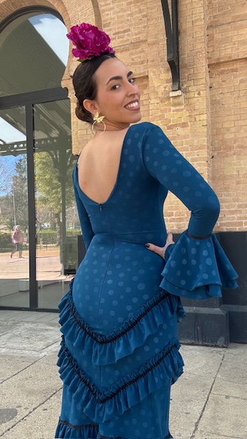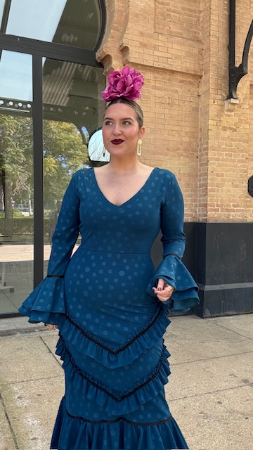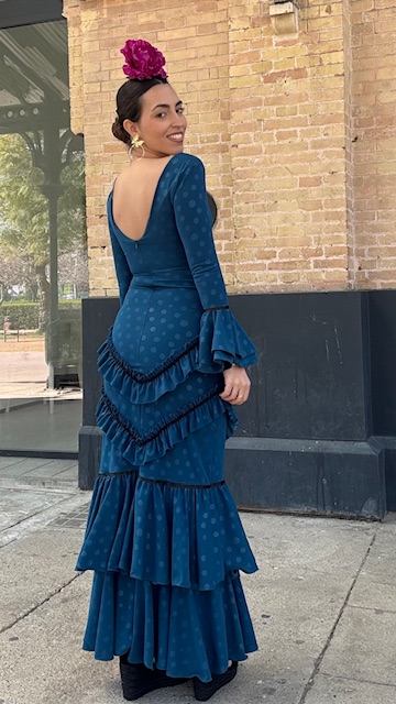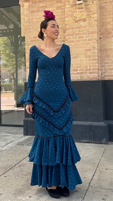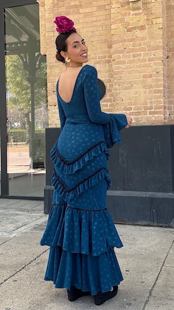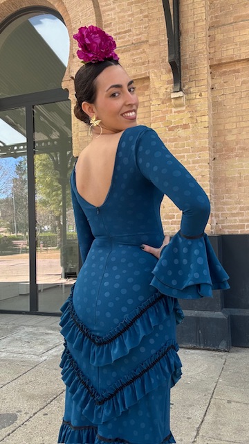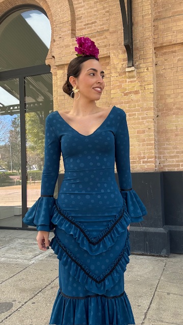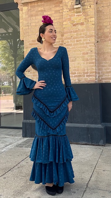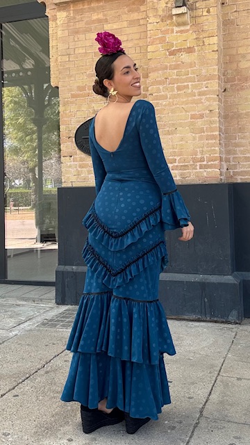 Vestido de flamenca con volantes en pico en color petróleo con estampado de lunares en color petroleo.