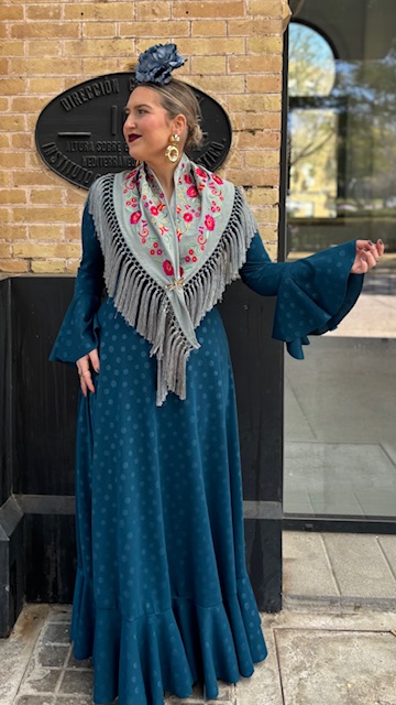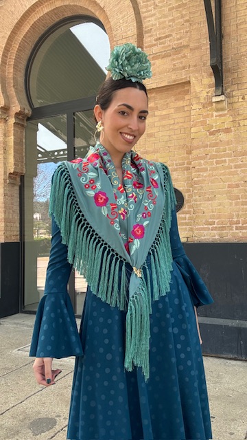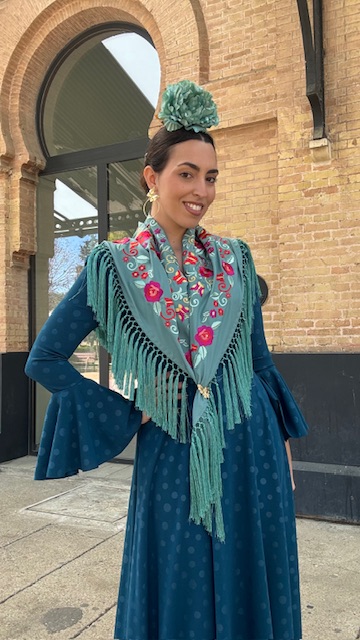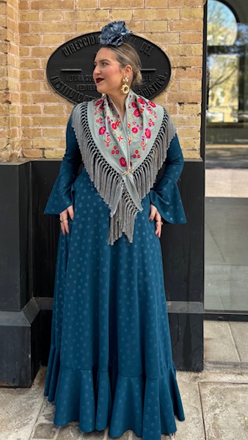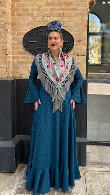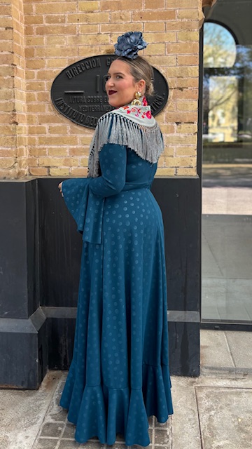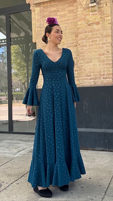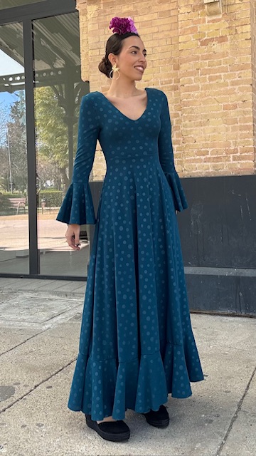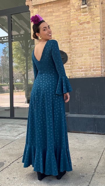 Vestido de flamenca en color petróleo con estampado de lunares en color petróleo. Disponible por tallas.