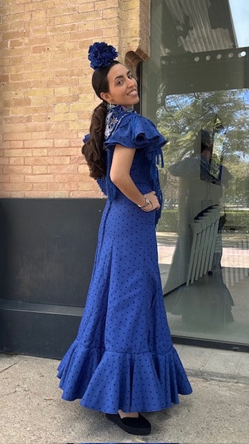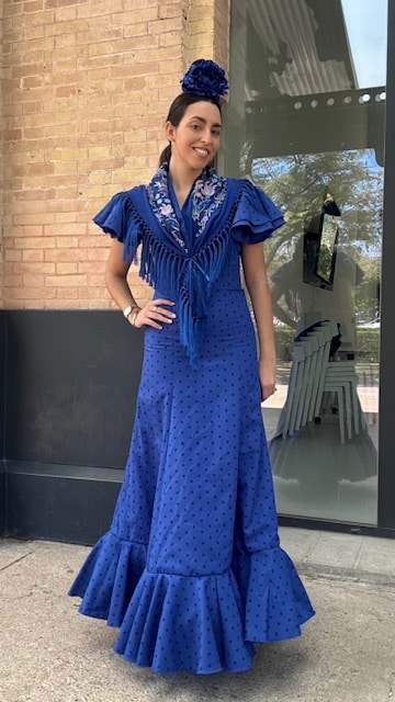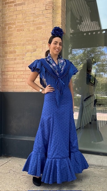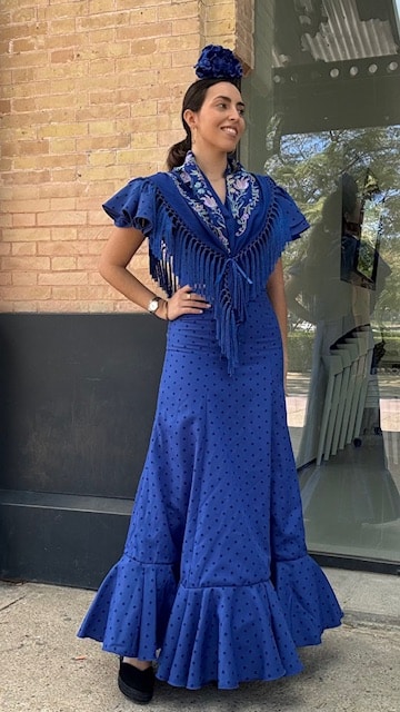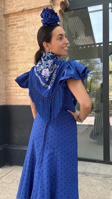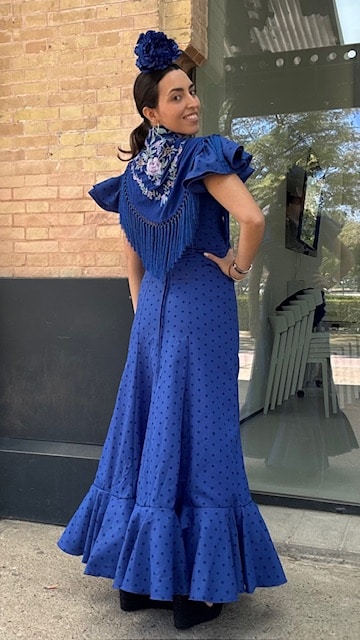 Vestido de flamenca con estampado de lunares en azul klein con dos volantes a la sisa y uno en la falda. Disponible por tallas.