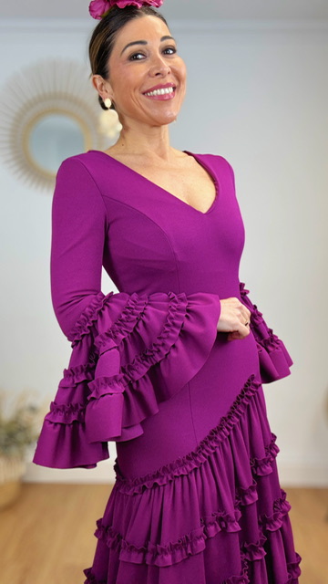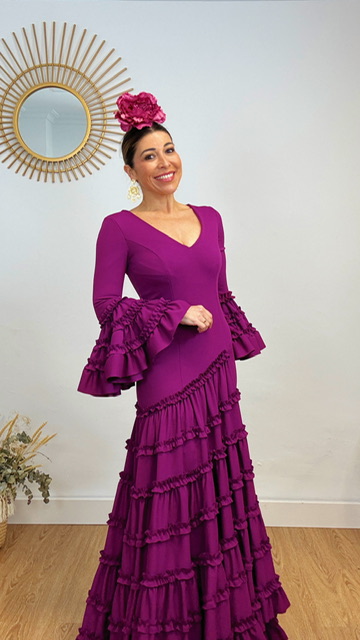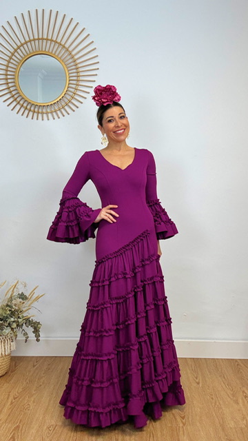 Vestido de flamenca confeccionado en tejido de crepé elástico en color buganvilla. Disponible por tallas que se adapta muy bien al ser tejido elástico.