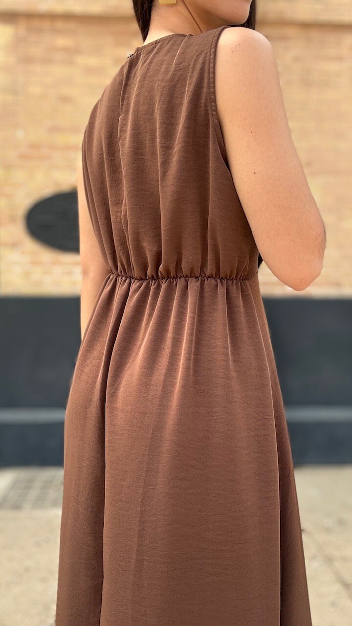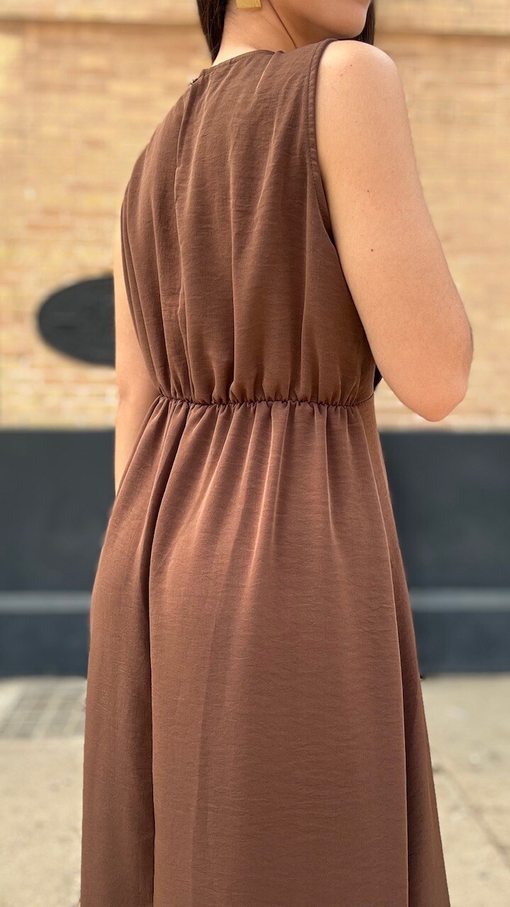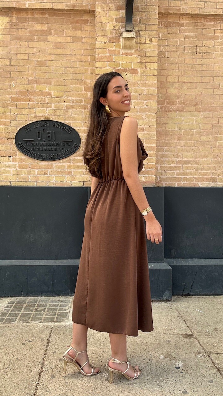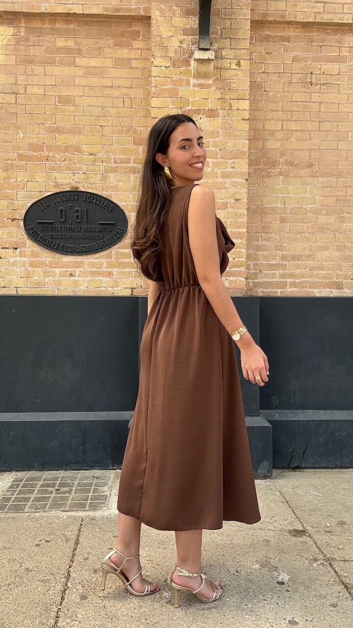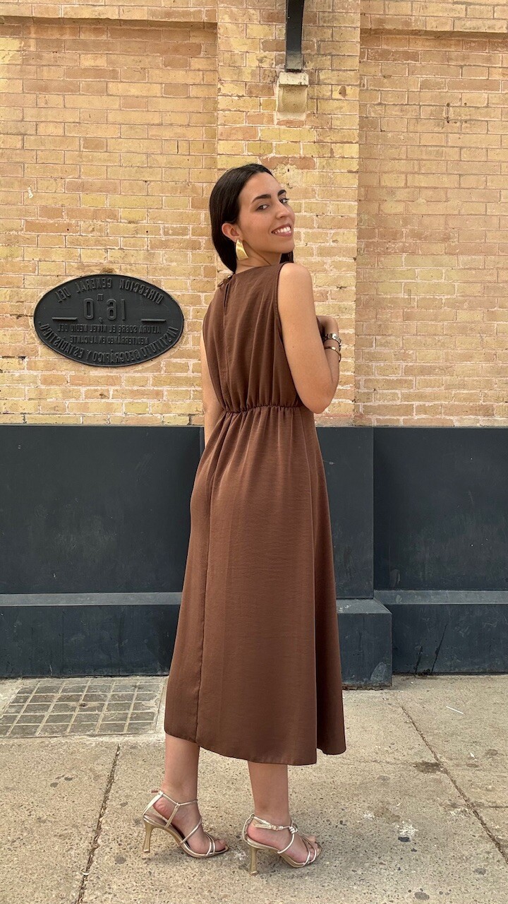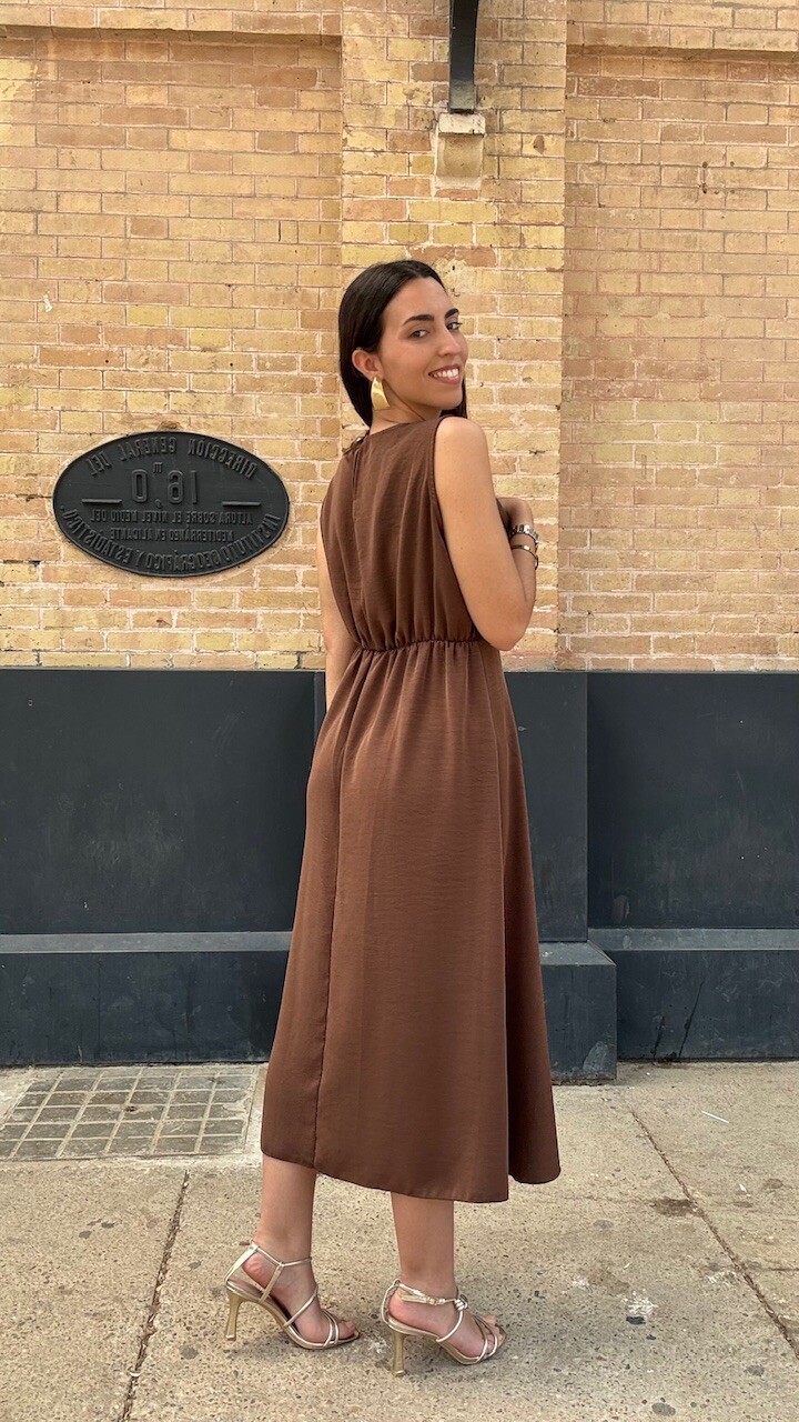 Vestido midi confeccionado en tejido de gasa con mangas a la sisa y cinturilla elástica en color marrón. Talla única válida desde la talla 36 hasta la talla 42/44.