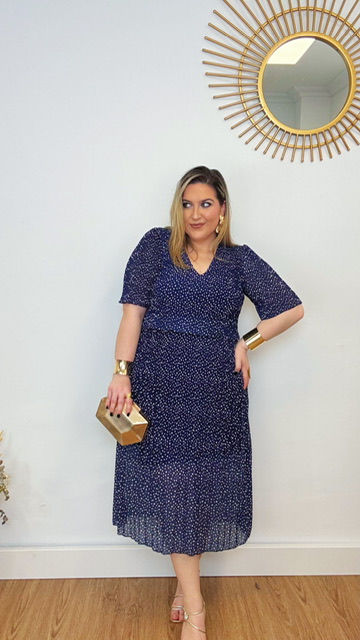 Vestido Gasa Plisado Lunares Azul Marino