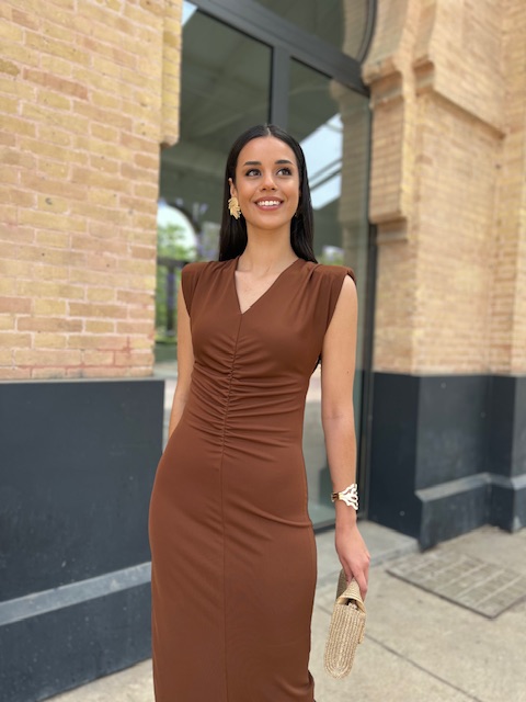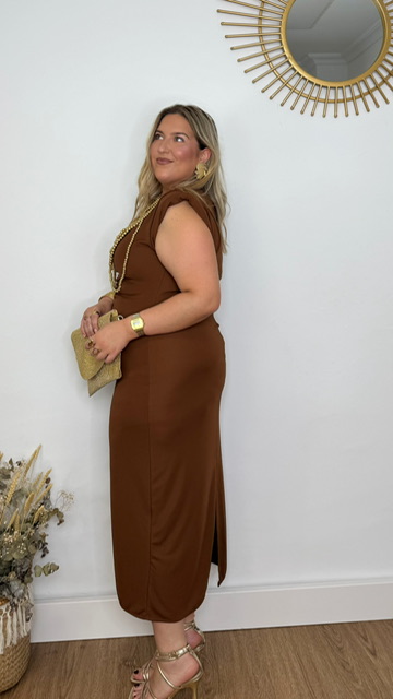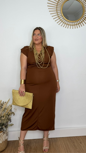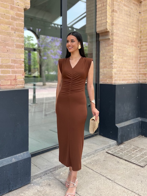 Vestido confeccionado en tejido de punto de licra en color marrón. Disponibles por tallas.