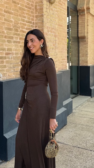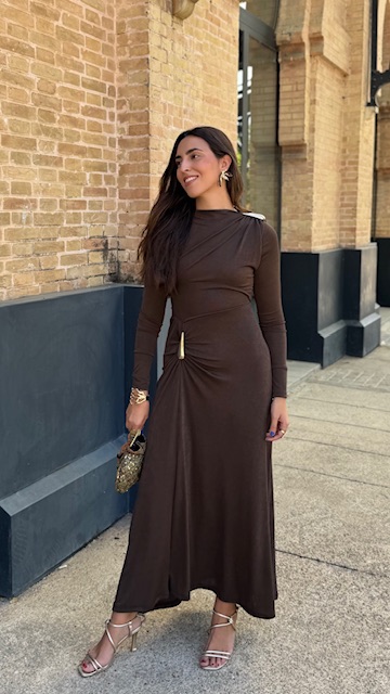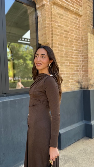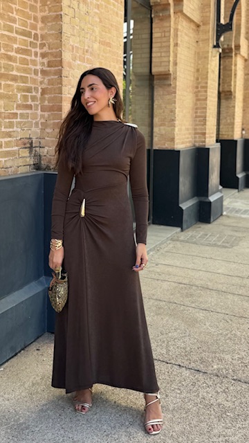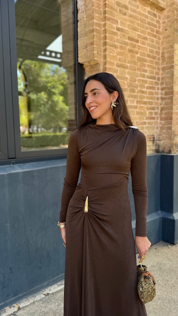 Vestido largo en color marrón con detalle de broche en hombre y cintura. Talla única válida desde la 36 hasta la 42.