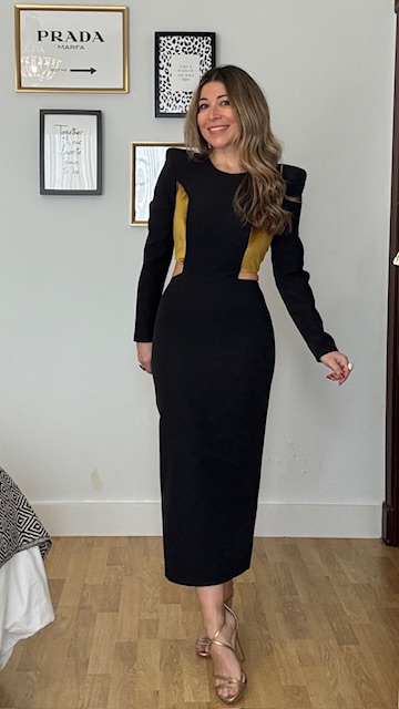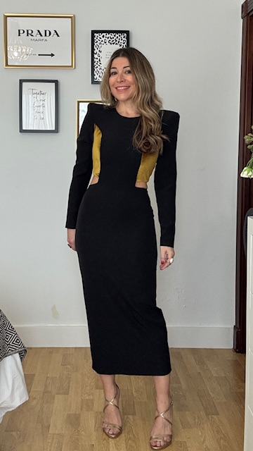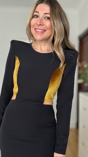 Vestido con hombreras de invitada con aberturas en los laterales en terciopelo mostaza en color negro . Disponible por tallas.
