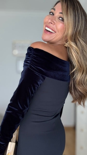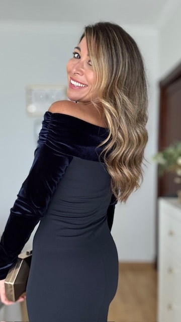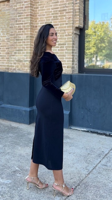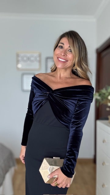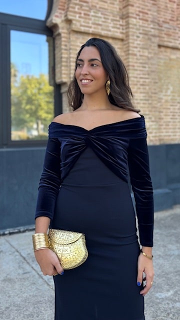 Vestido de invitada en color azul marino con hombros al descubierto en terciopelo. Talla única desde la 36 hasta la 40.