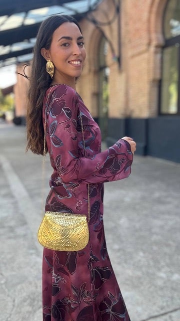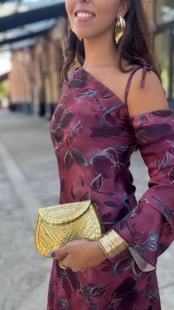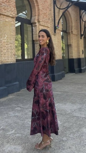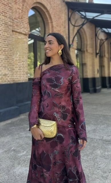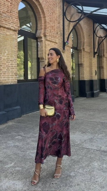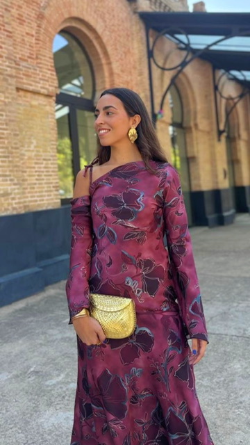 Vestido invitada asimétrico con estampado en buganvilla (La tiranta viene justa pero puedes descoserla y ponerla a tu medida). Talla única válida desde la 36 hasta la 40.