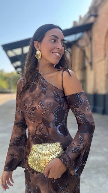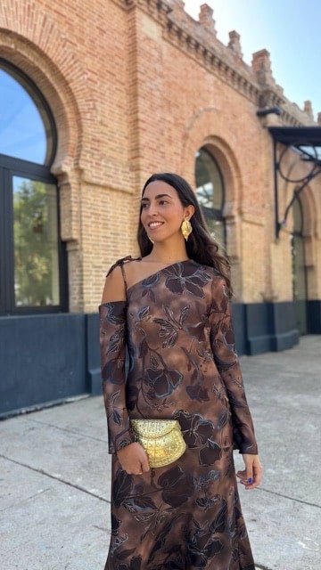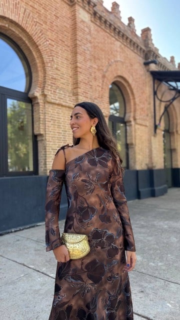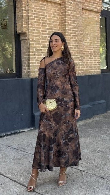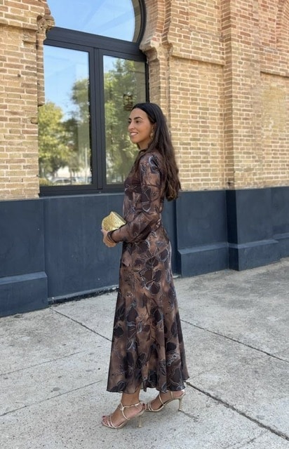 Vestido invitada asimétrico con estampado en marrón (La tiranta viene justa pero puedes descoserla y ponerla a tu medida). Talla única válida desde la 36 hasta la 40.