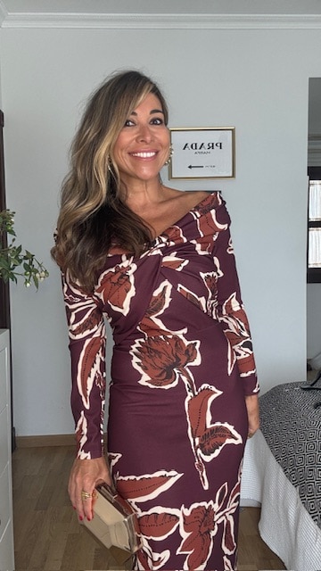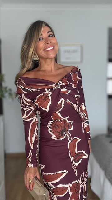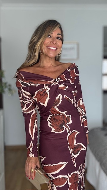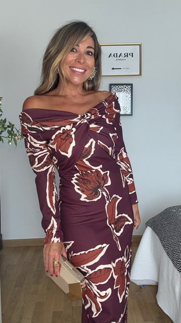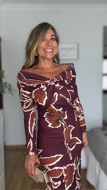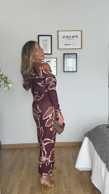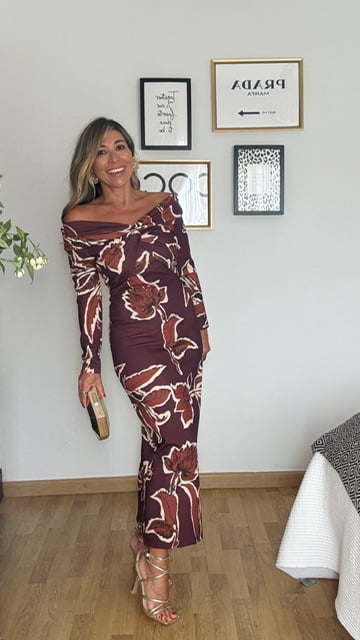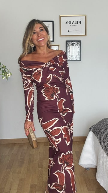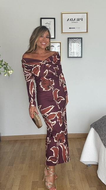 Vestido de largo tobillero en color berenjena con estampado floral en tonos tierra, un precioso diseño de escote bardot (off-shoulder), con un favorecedor nudo en el escote. Manga larga ideal para eventos de otoño. Confeccionado en tejido de crepe elástico. Talla única.