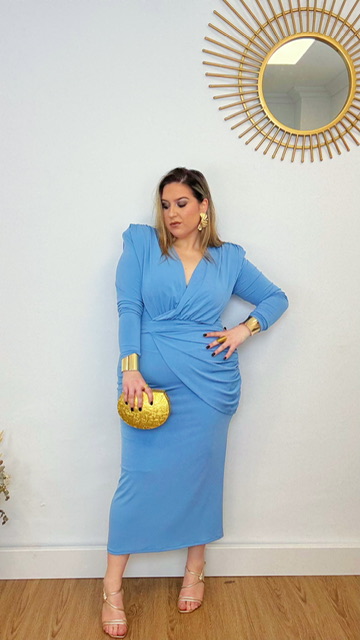 Vestido de invitada midi confeccionado en tejido de licra elástica con hombreras en color celeste. Disponible por tallas.