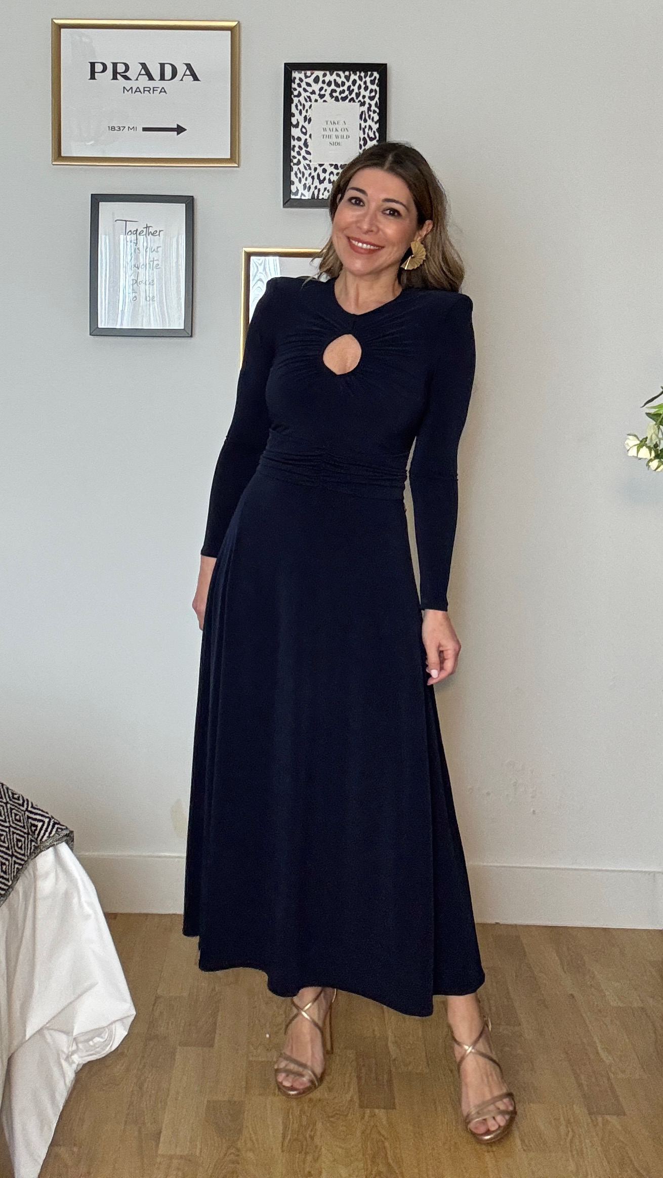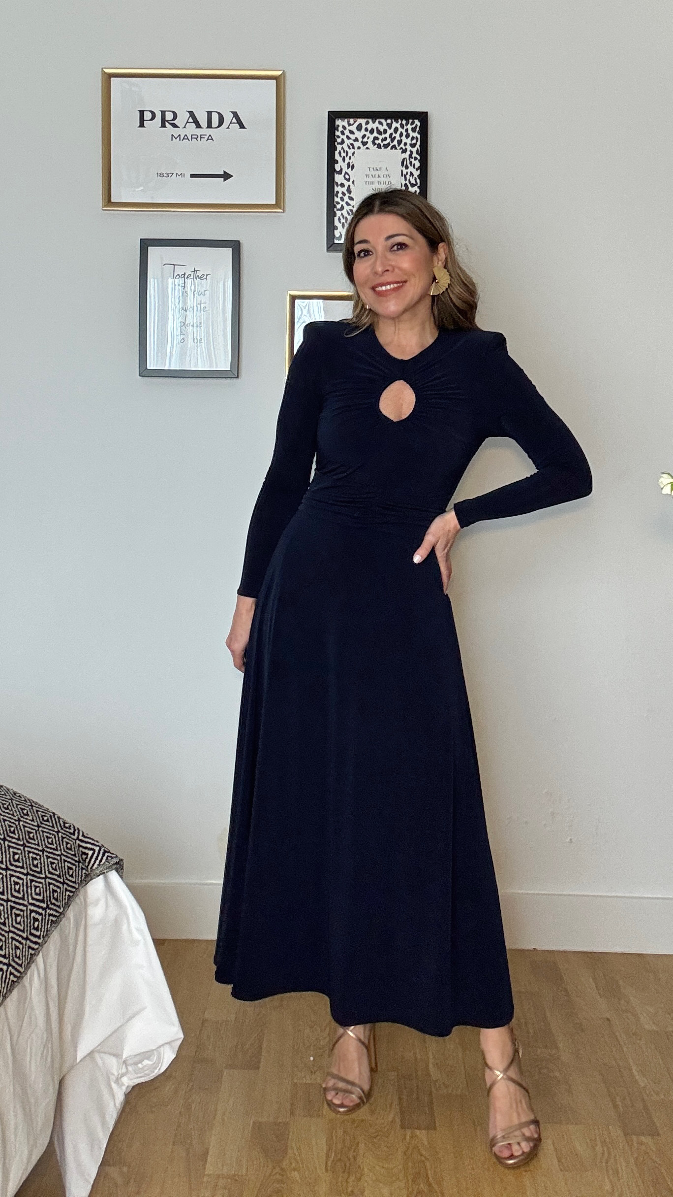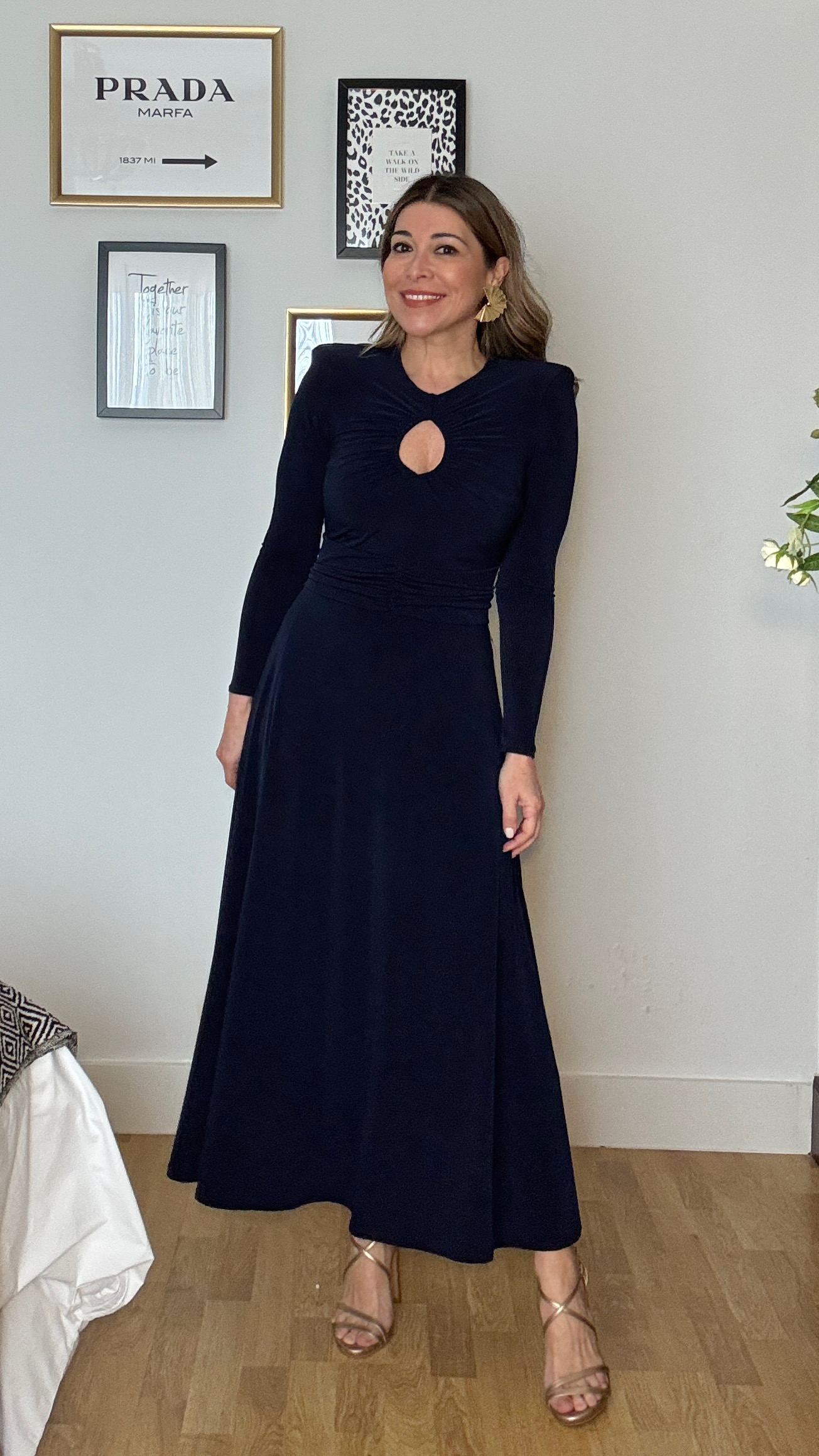 Vestido de Invitada confeccionado en tejido de punto de licra elástico, de largo midi y detalle de abertura central y cuerpo con hombreras. Confección española. Disponible en tallas 36, 38, 40, 42 y 44. Si no encuentras tu talla disponible escríbenos por whatsaap al 674885337 para solicitarla.