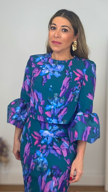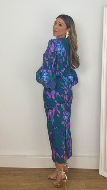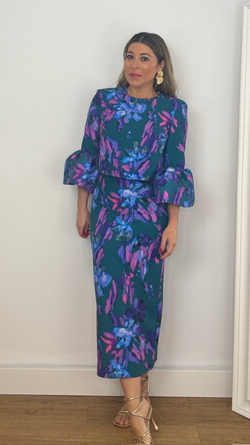 Vestido de invitada midi estampado de corte entallado. Lleva escote cerrado y mangas con volantes. Disponible por tallas.